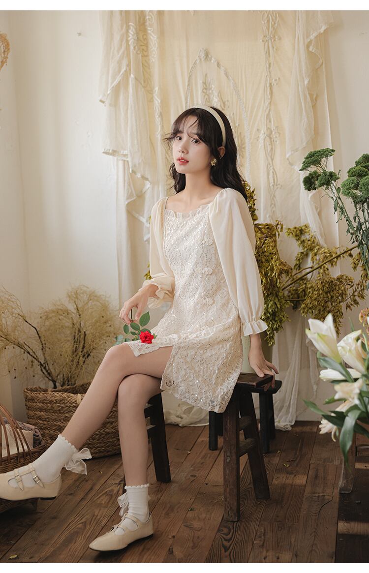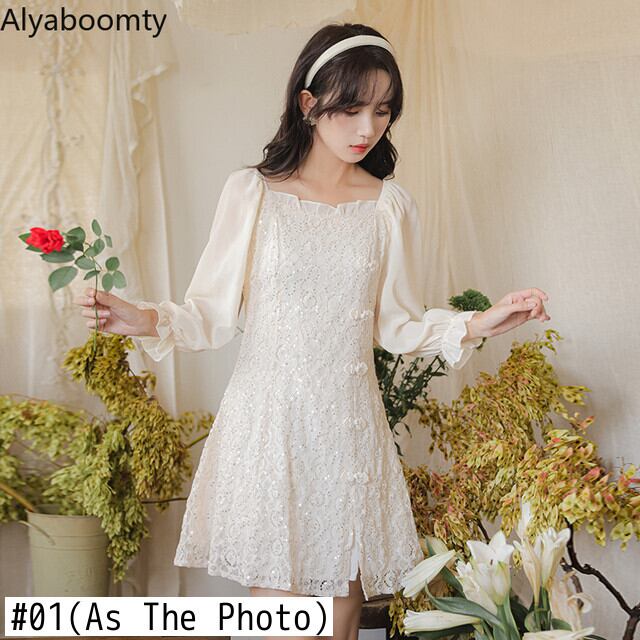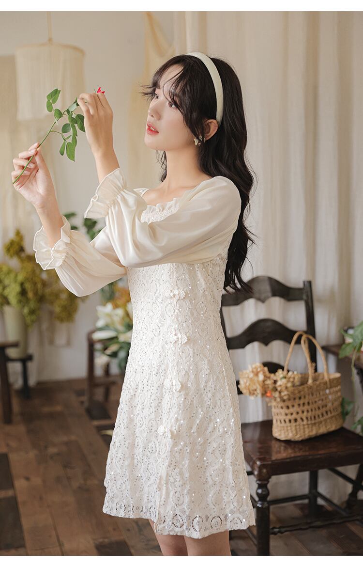 送料無料୨♥୧ スプリングオータムレディースミニドレス カラーレーススリーブ 大人ガーリー スウィート キュート カジュアル 春物 秋物 スクウェア AOS66247889686