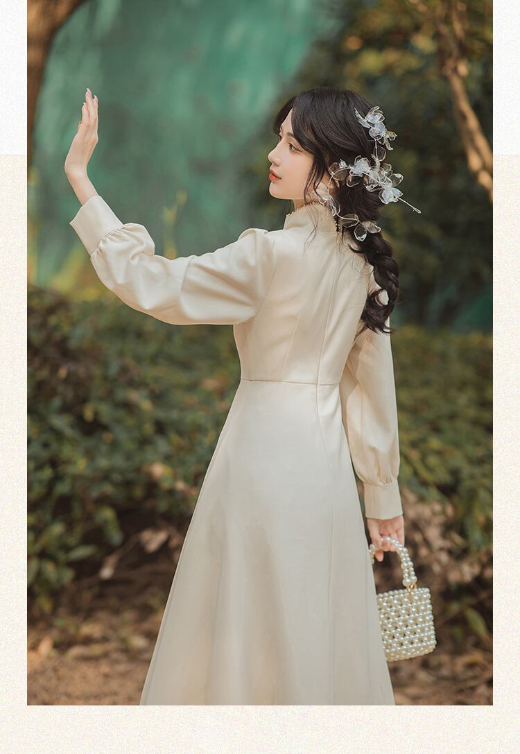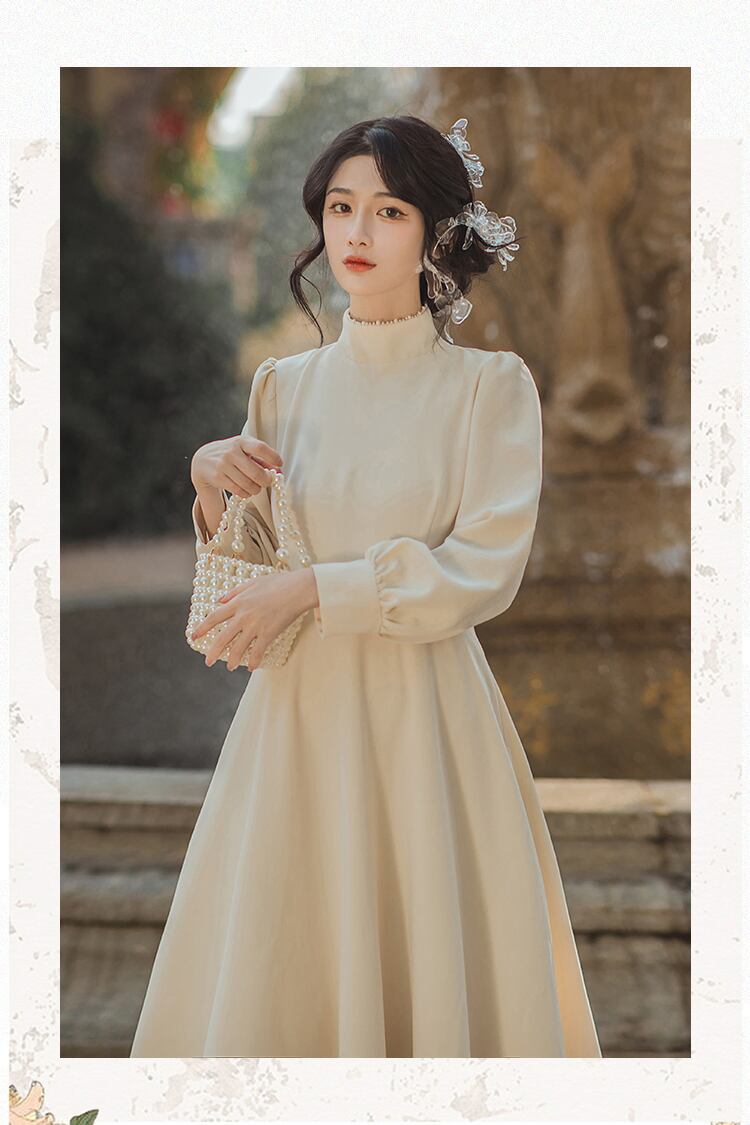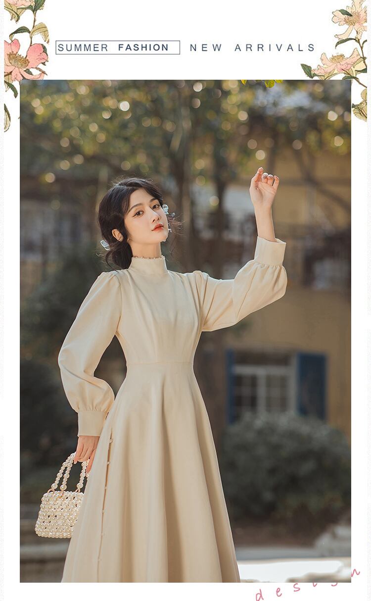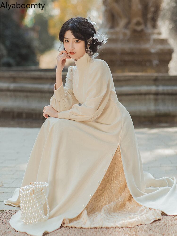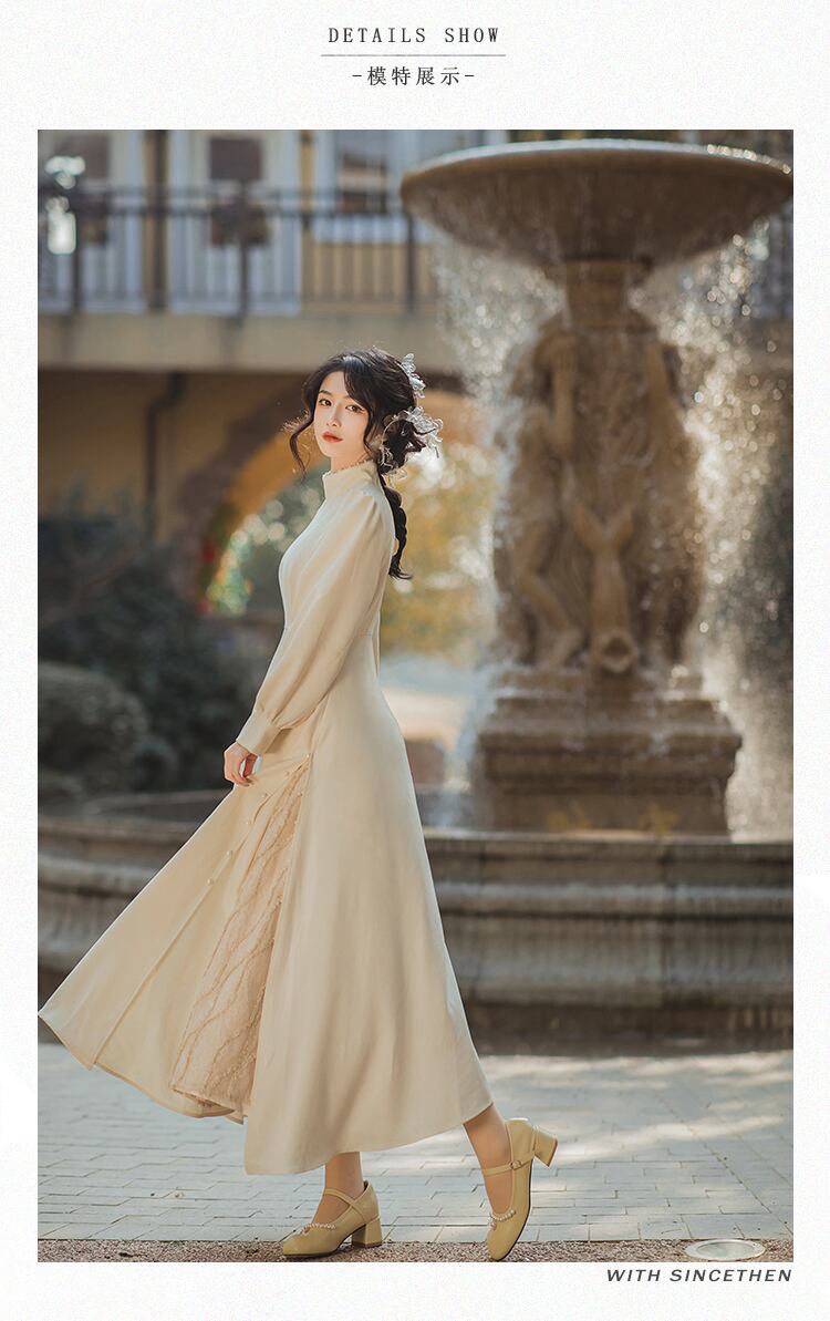 送料無料୨♥୧ オータムウィンターレディースロングドレス スタンドカラーカラーブラックレッドパッチワークレースヴィンテージ 秋物 冬物 ビンテージ AOS54250814700