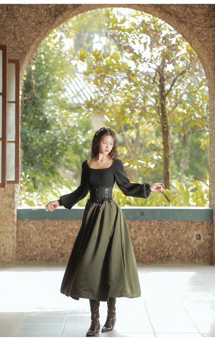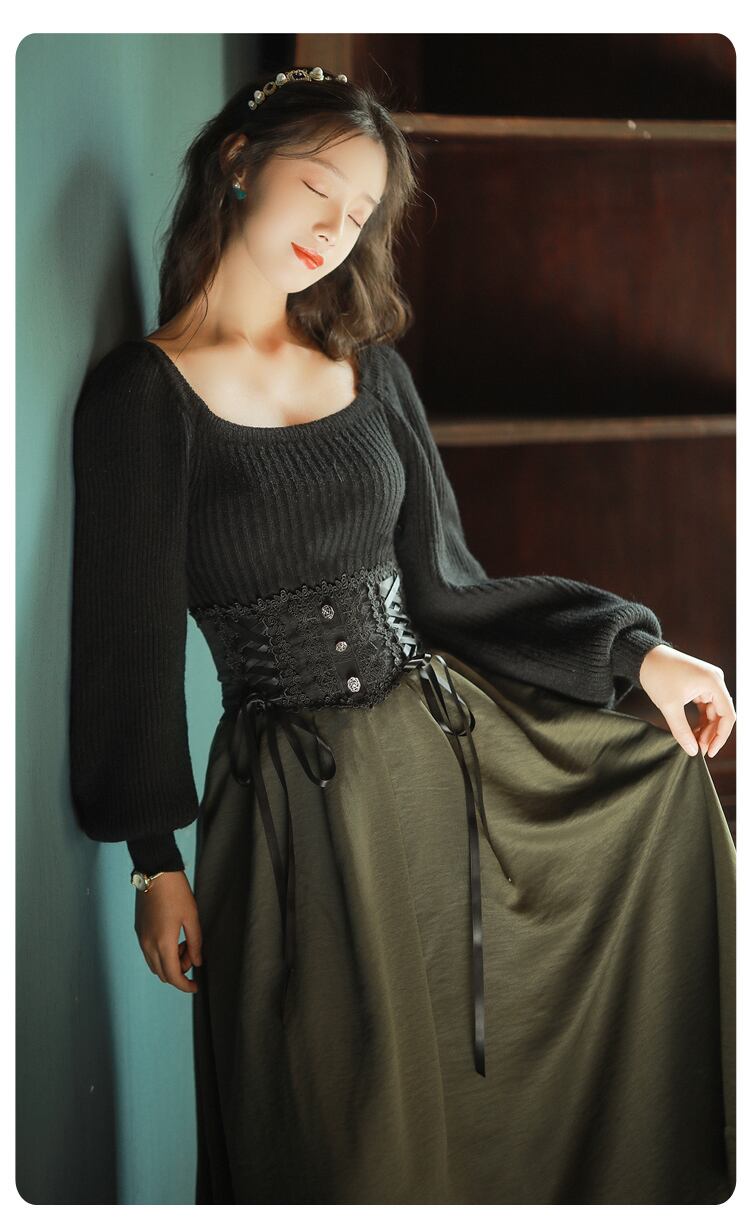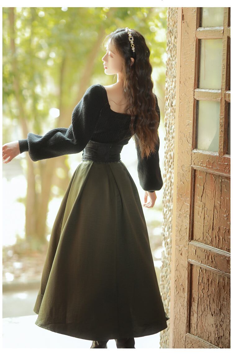 送料無料୨♥୧ スタイルオータムウィンターレディースロングスカート ウェストブラックレースパッチワークバンドAライングリーン 秋物 冬物 ヨーロピアン AOS11695673653