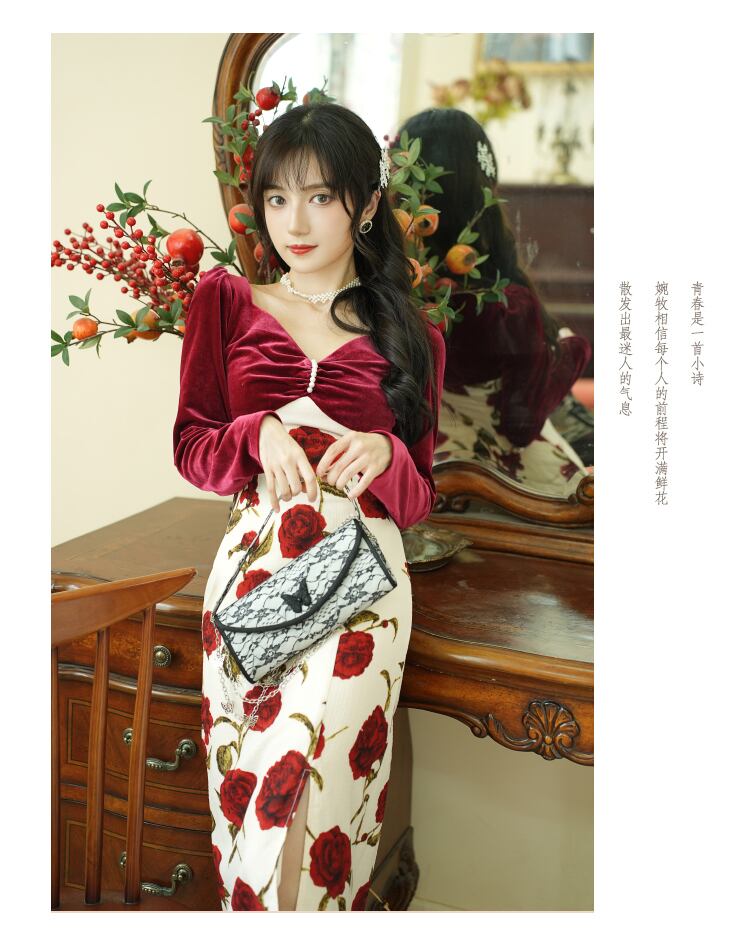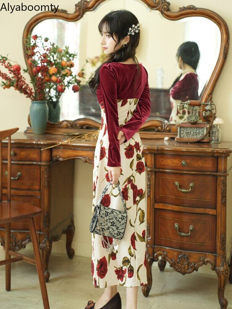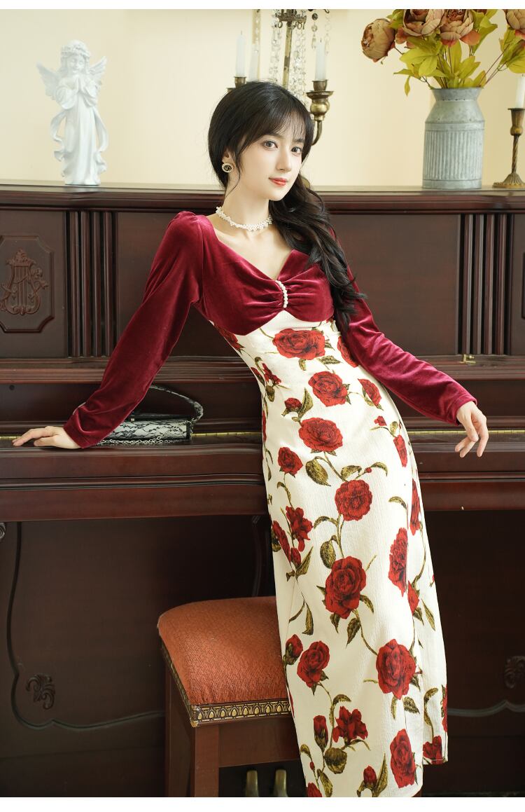 送料無料୨♥୧ スプリングオータムレディースレッドミディドレス Vネックベルベットパッチワークフローラルロング 春物 秋物 花柄 AOS42569717493