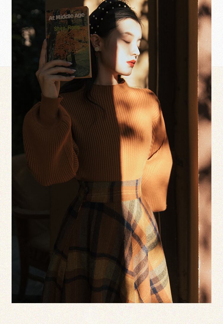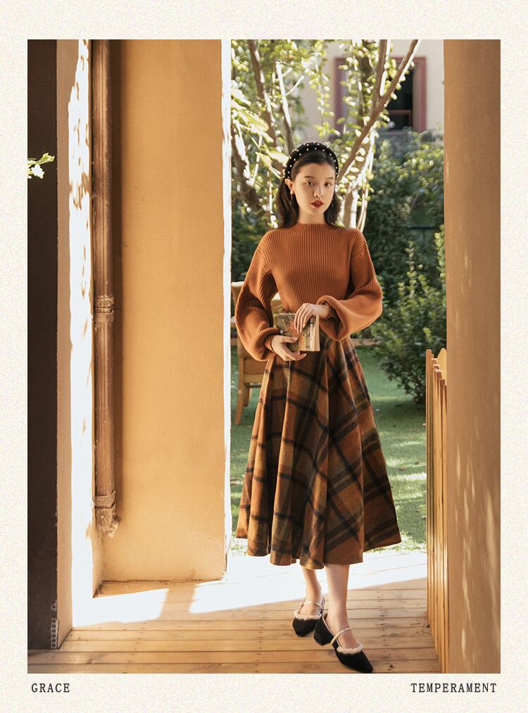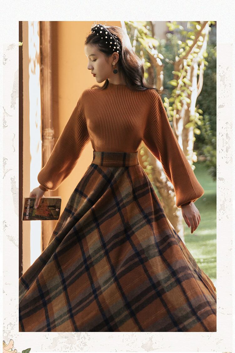 送料無料୨♥୧ スタイルオータムウィンターレディーススリーブニット セーター 格子柄ミディスカート ヴィンテージセット ランタンスリーブ 秋物 冬物 ビンテージ ヨーロピアン AOS27592233854