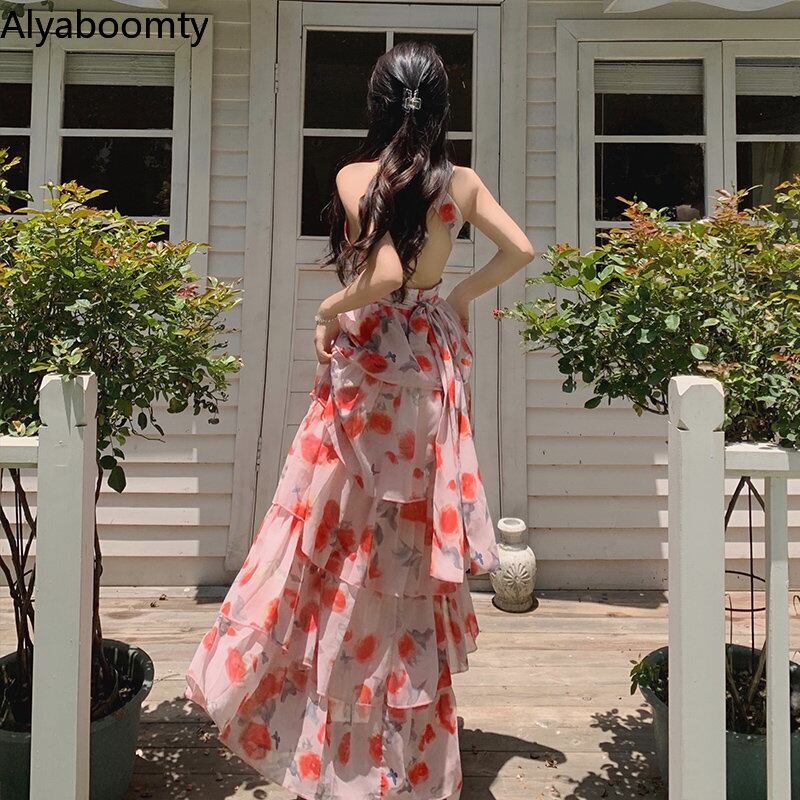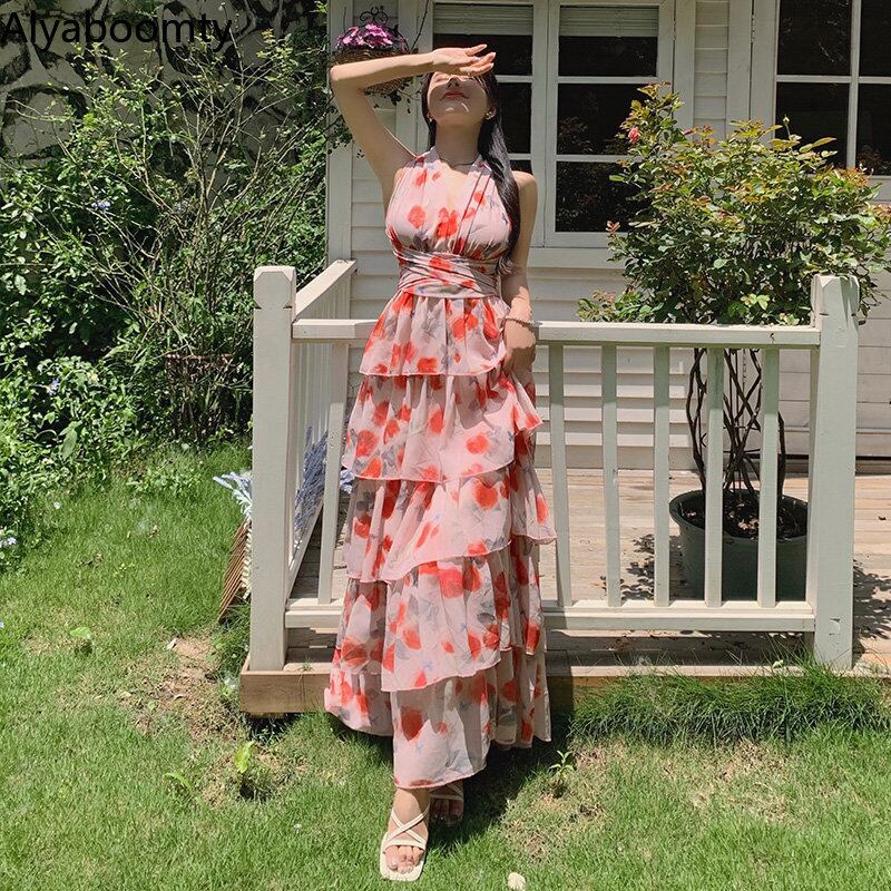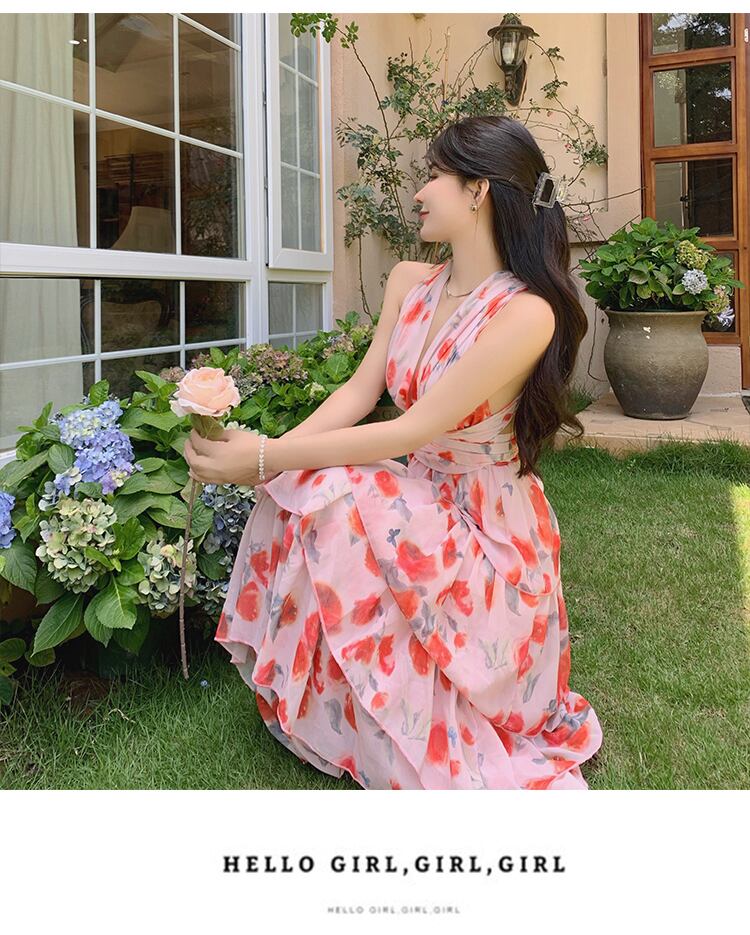 送料無料୨♥୧ サマーレディースフローラルロングドレス ホルターバックレスノースリーブシフォンフリル レッド ラッフル 夏物 ビーチ 花柄 AOS66206596639