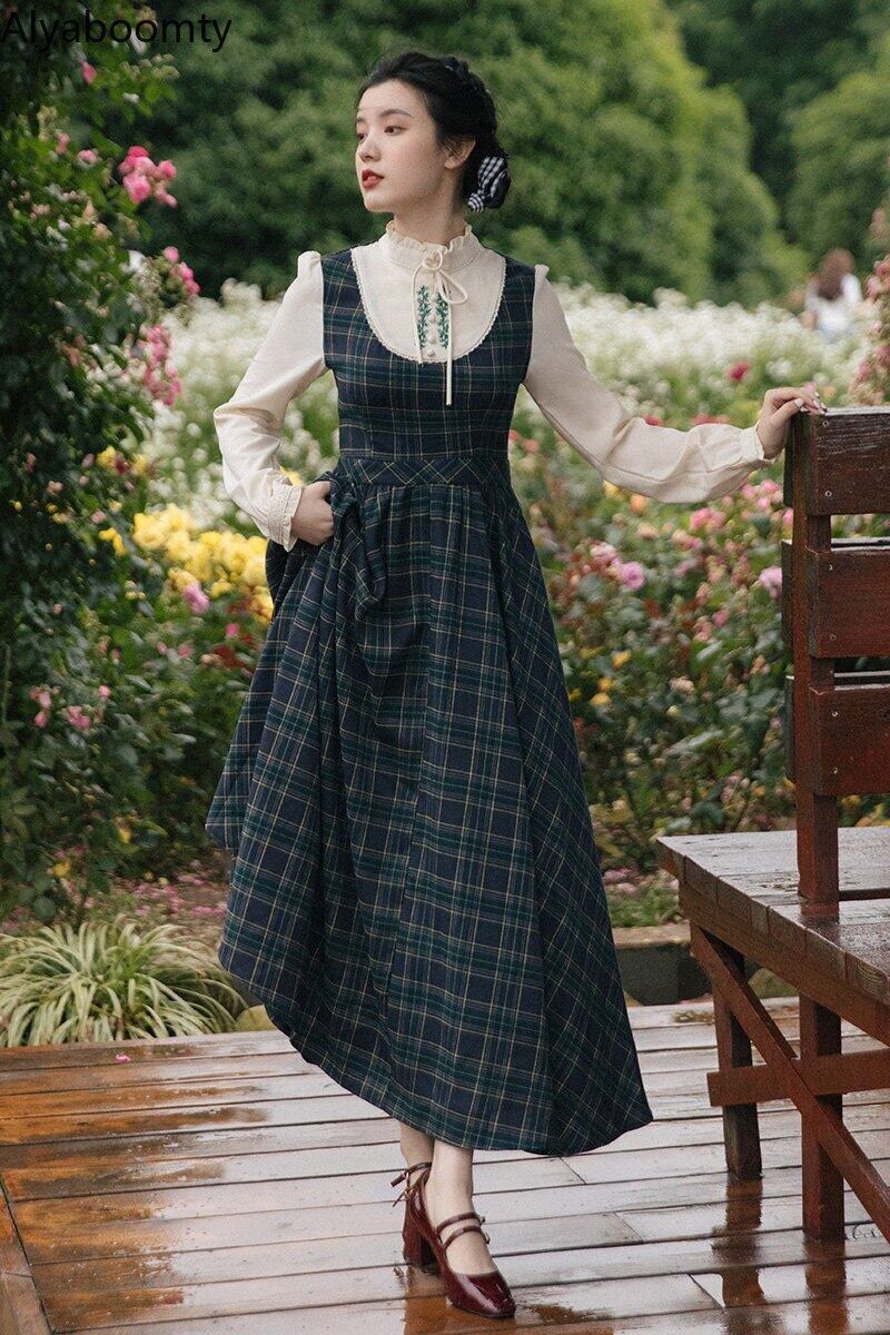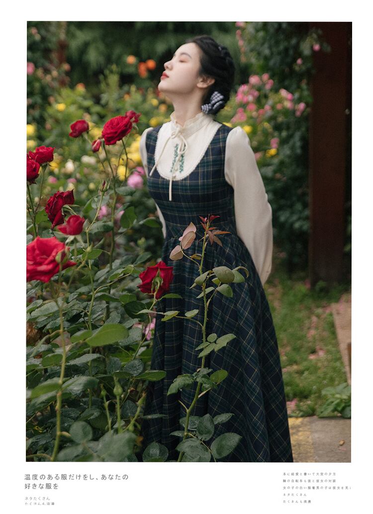 送料無料୨♥୧ オータムウィンターレディースマキシドレス スタンドカラーカラーパッチワークグリーン格子柄フローラル刺繍ヴィンテージドレス ワンピース 大人ガーリー スウィート キュート カジュアル 秋物 冬物 花柄 ビンテージ AOS11530068504