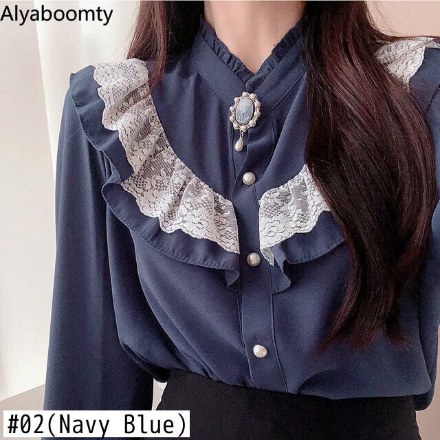 送料無料୨♥୧ スタイルスプリングオータムレディースブラウス スタンドカラーカラーベージュネイビーレースフリル ラッフル 大人ガーリー スウィート キュート カジュアル 春物 秋物 AOS99487376459