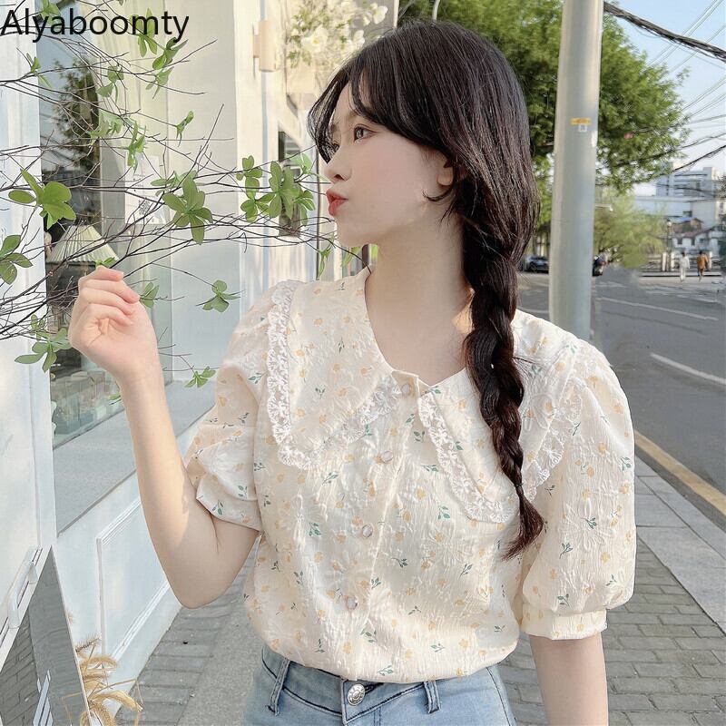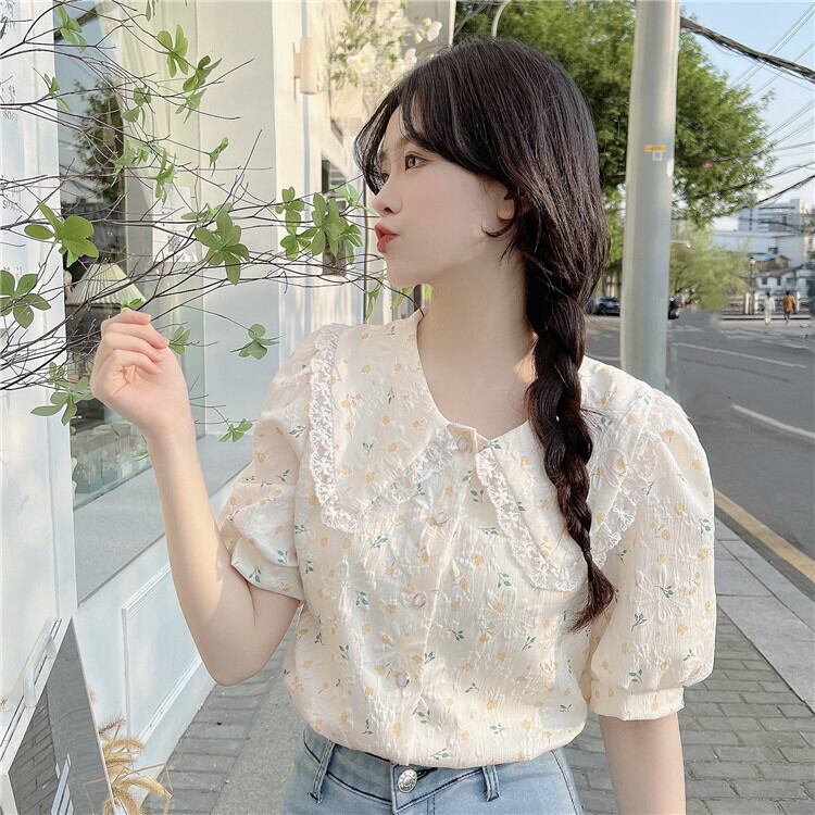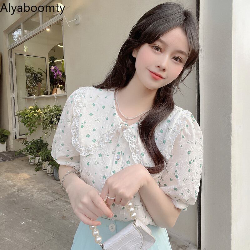 送料無料୨♥୧ サマーレディースシャツ イエローグリーンフローラルプリントカラーレーストップス ブラウス 大人ガーリー スウィート キュート カジュアル 夏物 花柄 AOS42800994690
