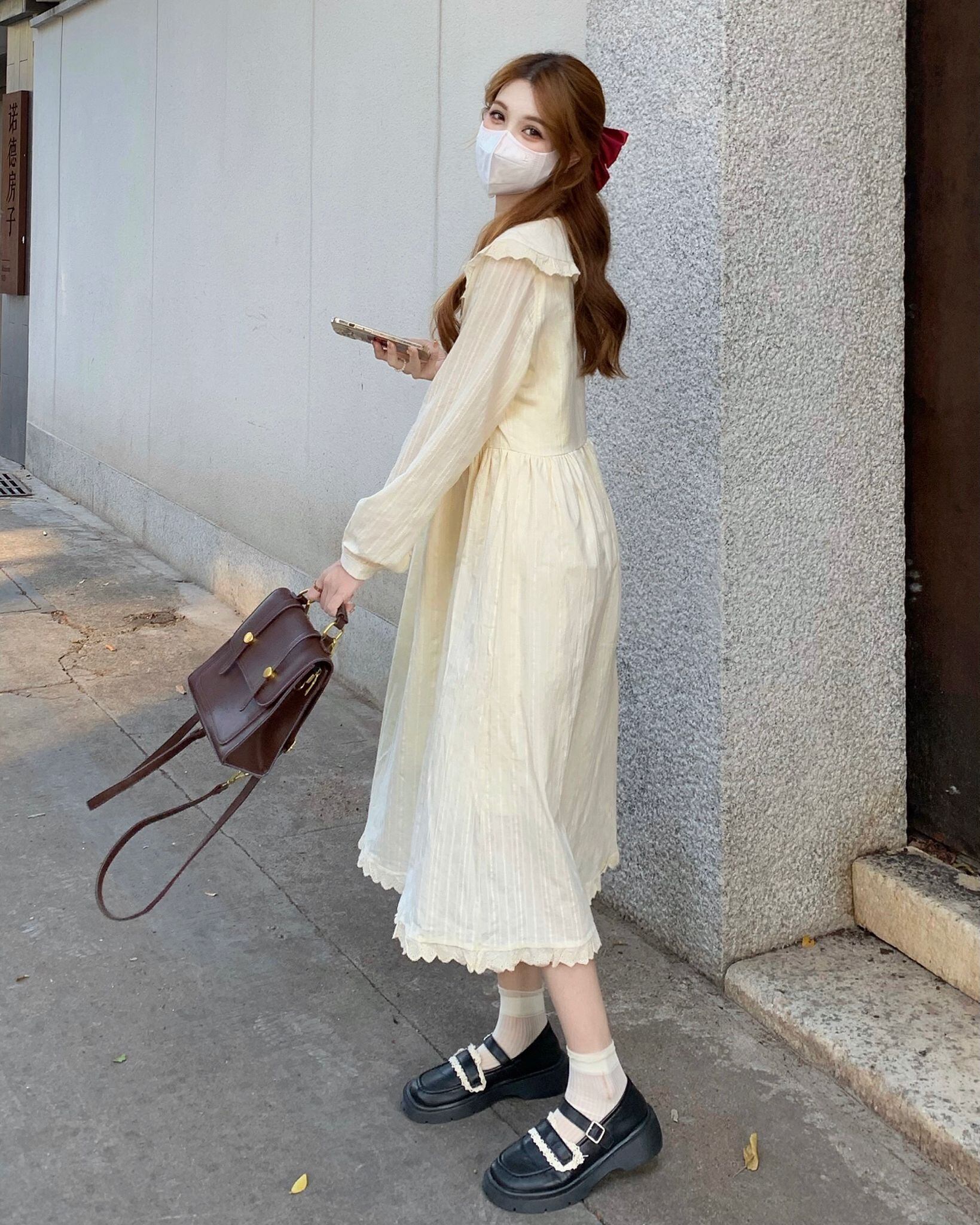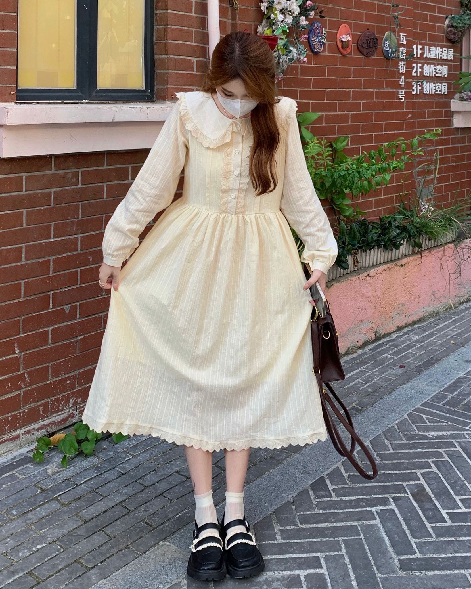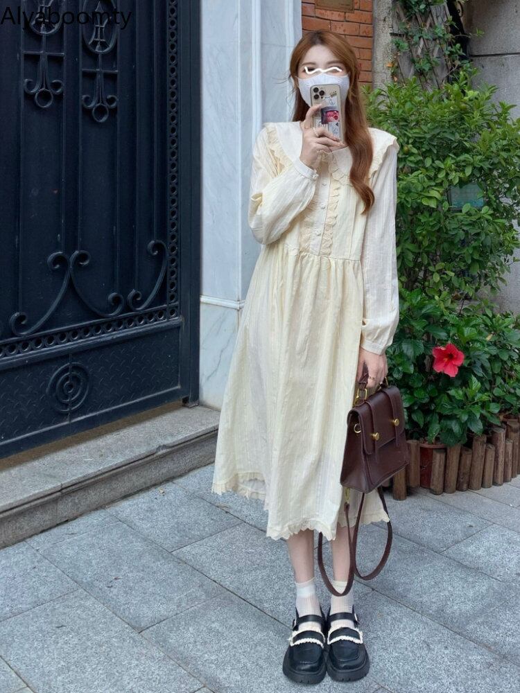 送料無料୨♥୧ スプリングオータムレディースミディドレス カラーレースフリル長袖スリーブドレス ワンピース ロング ラッフル 大人ガーリー スウィート キュート カジュアル 春物 秋物 AOS76765519973