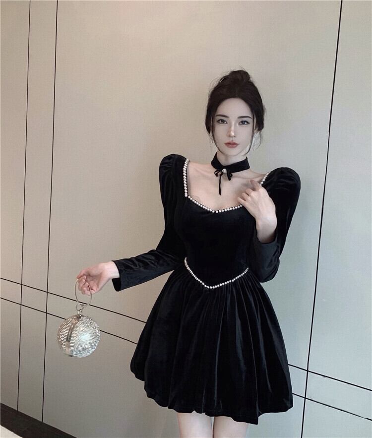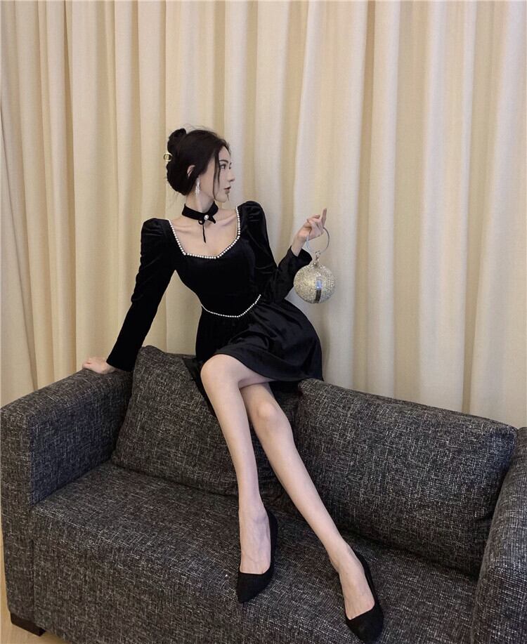 送料無料୨♥୧ オータムウィンターレディースブラックミニドレス カラースリムAラインスリーブベルベット 秋物 冬物 スクウェア AOS23002443134