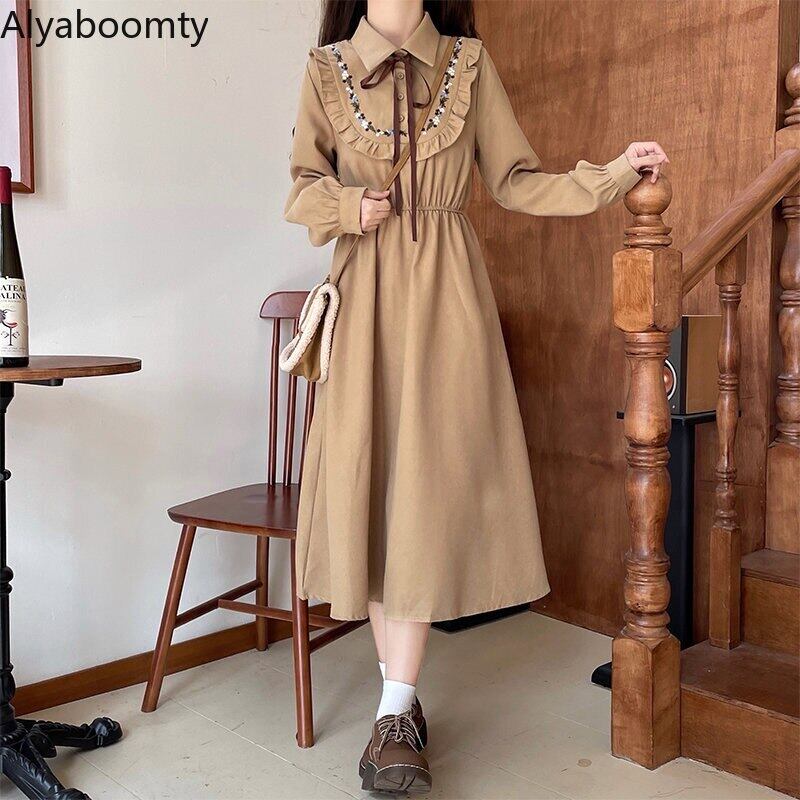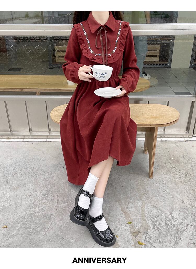 送料無料୨♥୧ スプリングオータムレディースミディドレス カラーブルーカーキレッドフローラル刺繍ヴィンテージドレス ワンピース 大人ガーリー スウィート キュート カジュアル 春物 秋物 花柄 ビンテージ AOS79819841202