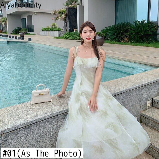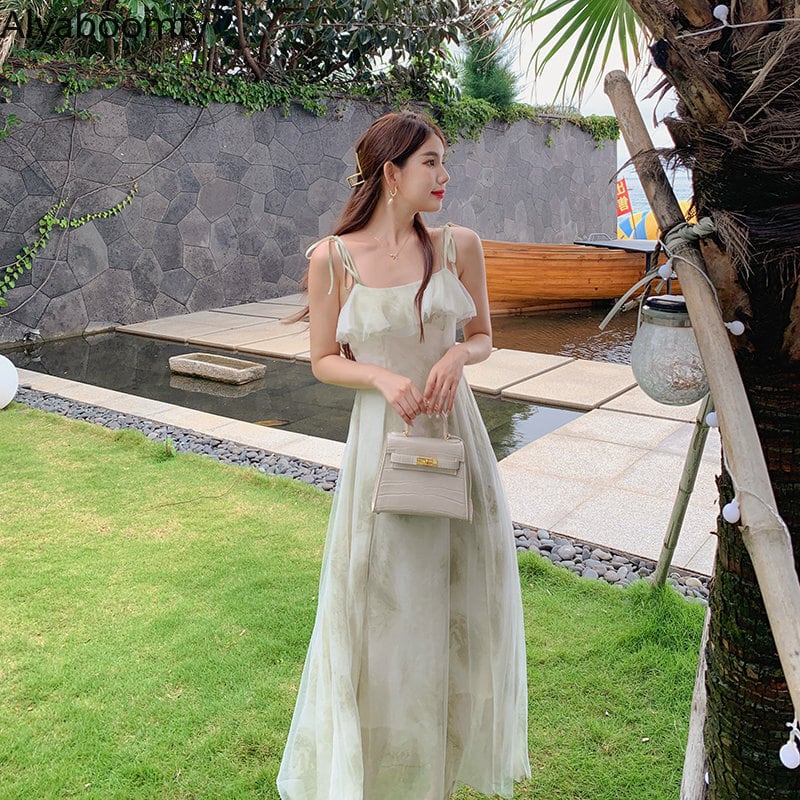 送料無料୨♥୧ サマーレディースボヘミアンドレス ストラップ フリルプリントノースリーブシフォン ラッフル 大人ガーリー スウィート キュート カジュアル 夏物 ビーチ AOS61136472934