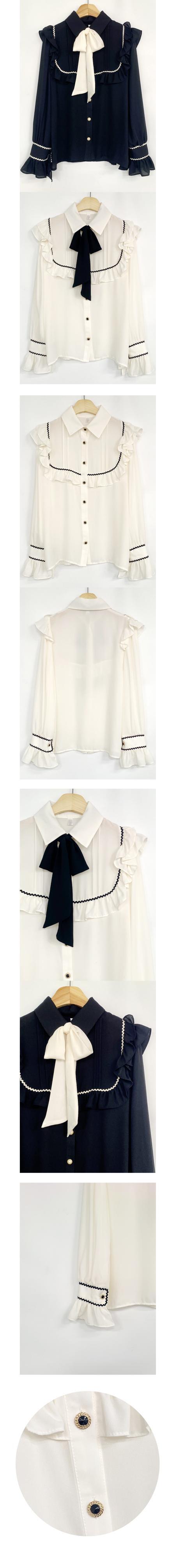 送料無料୨♥୧ スプリングオータムレディースベージュブラックブラウス スタイルカラーリボンフリルスリーブシャツ フレアスリーブ ラッフル 大人ガーリー スウィート キュート カジュアル 春物 秋物 ヨーロピアン AOS23578496821