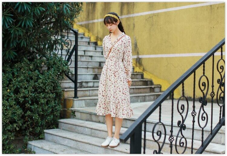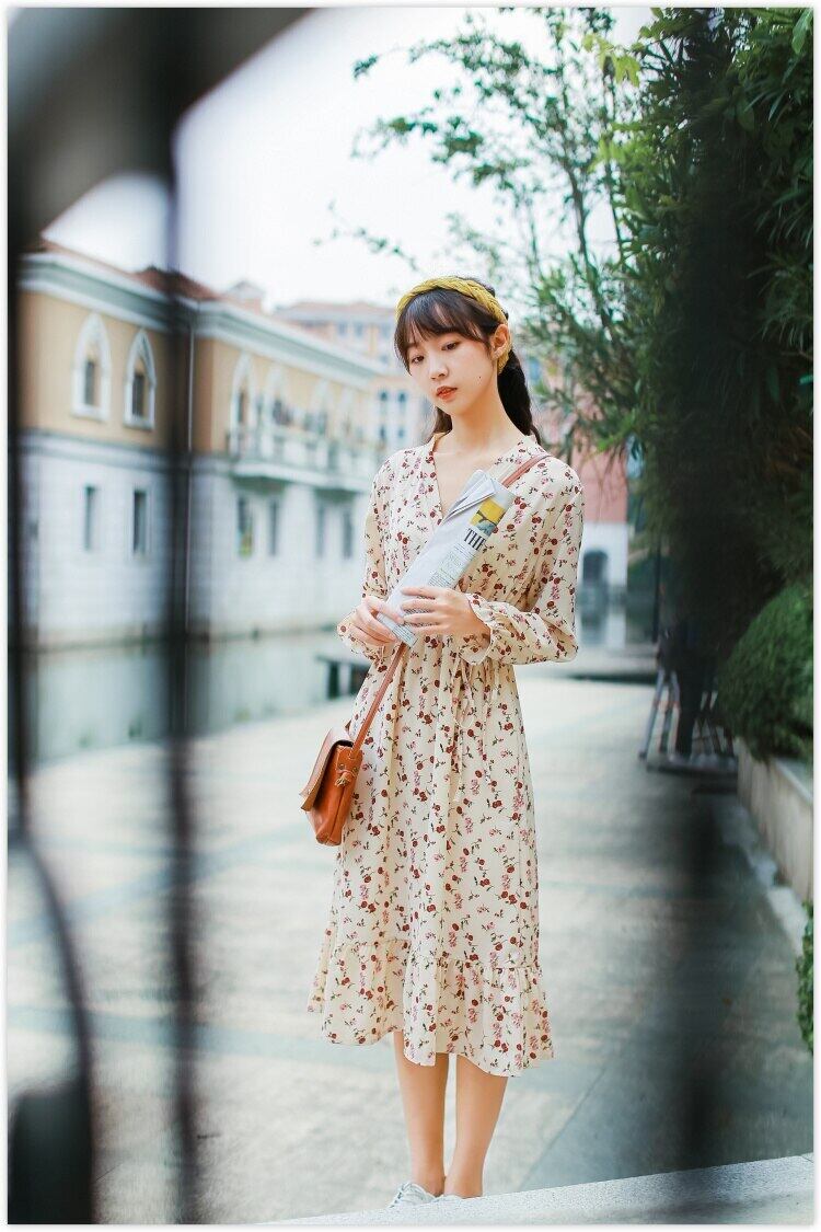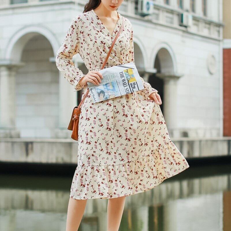 送料無料୨♥୧ スプリングオータムレディースロングドレス クロスフローラルプリント柄バンドフェミニーズシフォンフリル ラッフル 大人ガーリー スウィート キュート カジュアル 春物 秋物 花柄 AOS81952844696