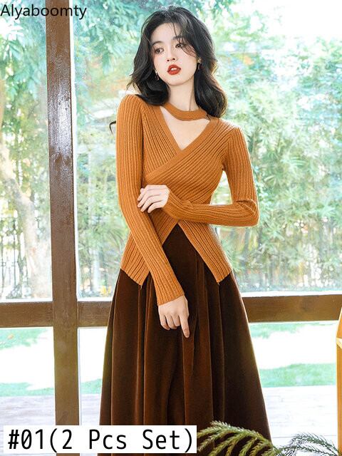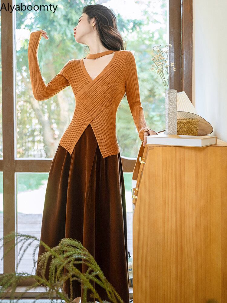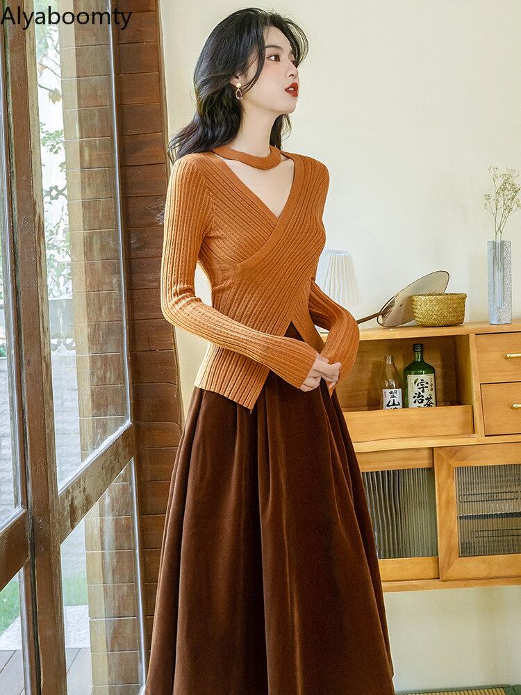 送料無料୨♥୧ スタイルオータムウィンターレディースセット Vネックニット ミディウェストスカート 秋物 冬物 ヨーロピアン AOS77093993939