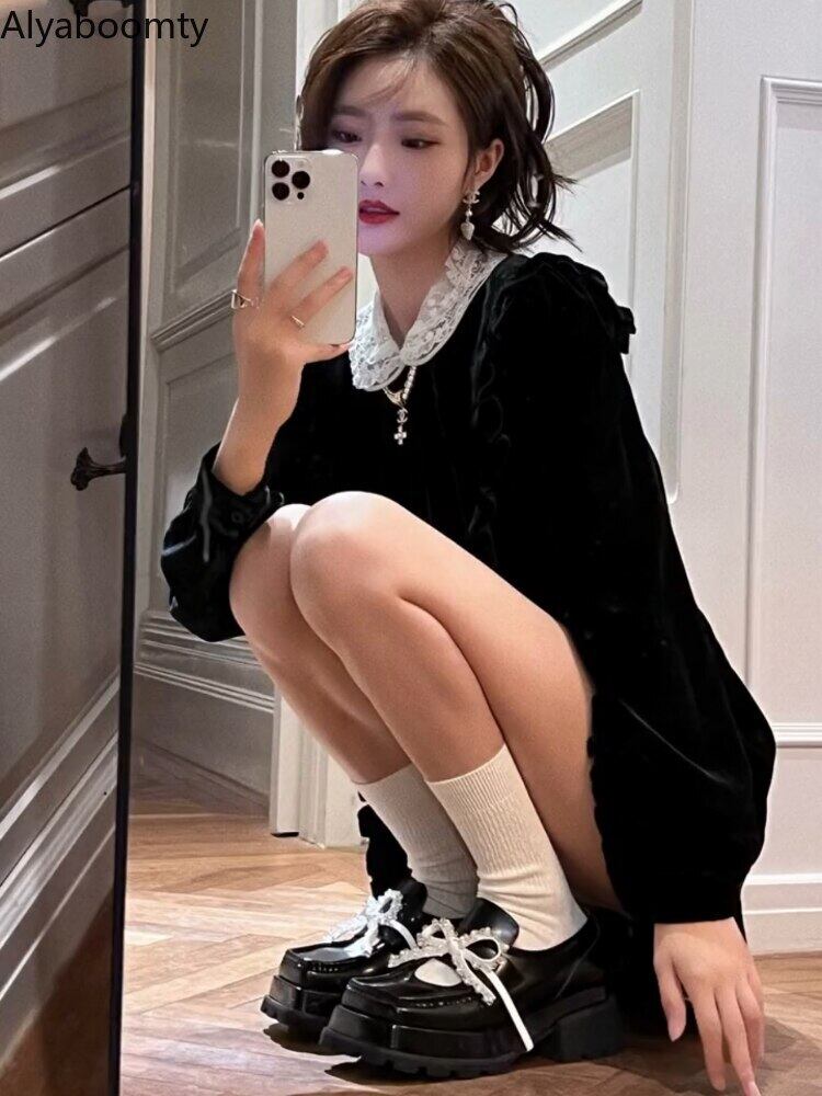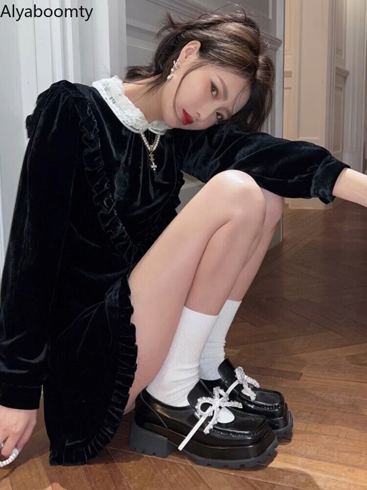 送料無料୨♥୧ オータムウィンターレディースブラックミニドレス カラーレースソリッド Aライン長袖スリーブベルベットショート ロング 秋物 冬物 ソリッドカラー AOS19871150918