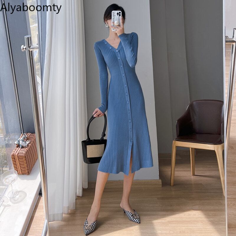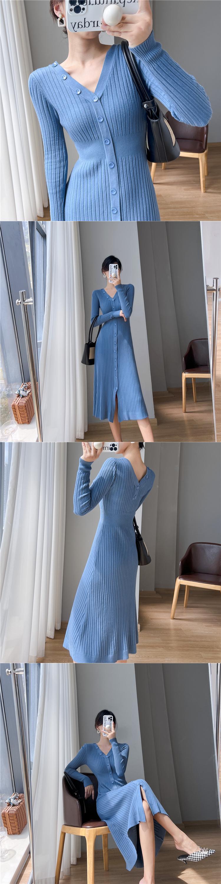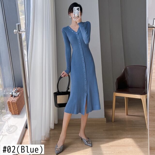 送料無料୨♥୧ オータムウィンターレディースニット ドレス Vネックブラックブルーセーター 秋物 冬物 パープル AOS34905950927