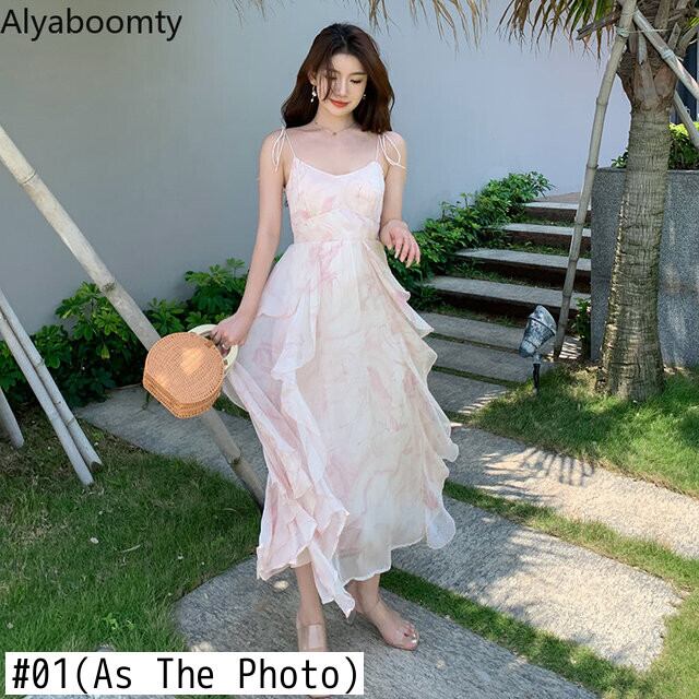 送料無料୨♥୧ スタイルサマーレディースドレス プリント柄シフォンフリルドレス ワンピース レッド ラッフル 夏物 AOS478896685