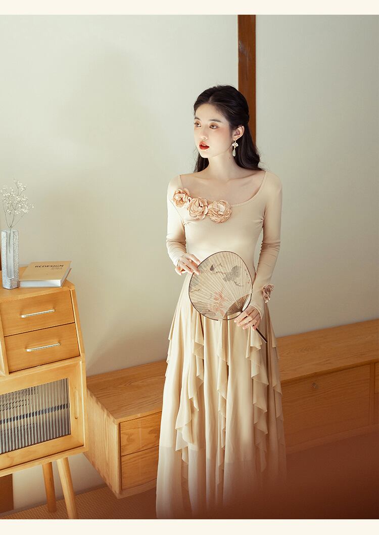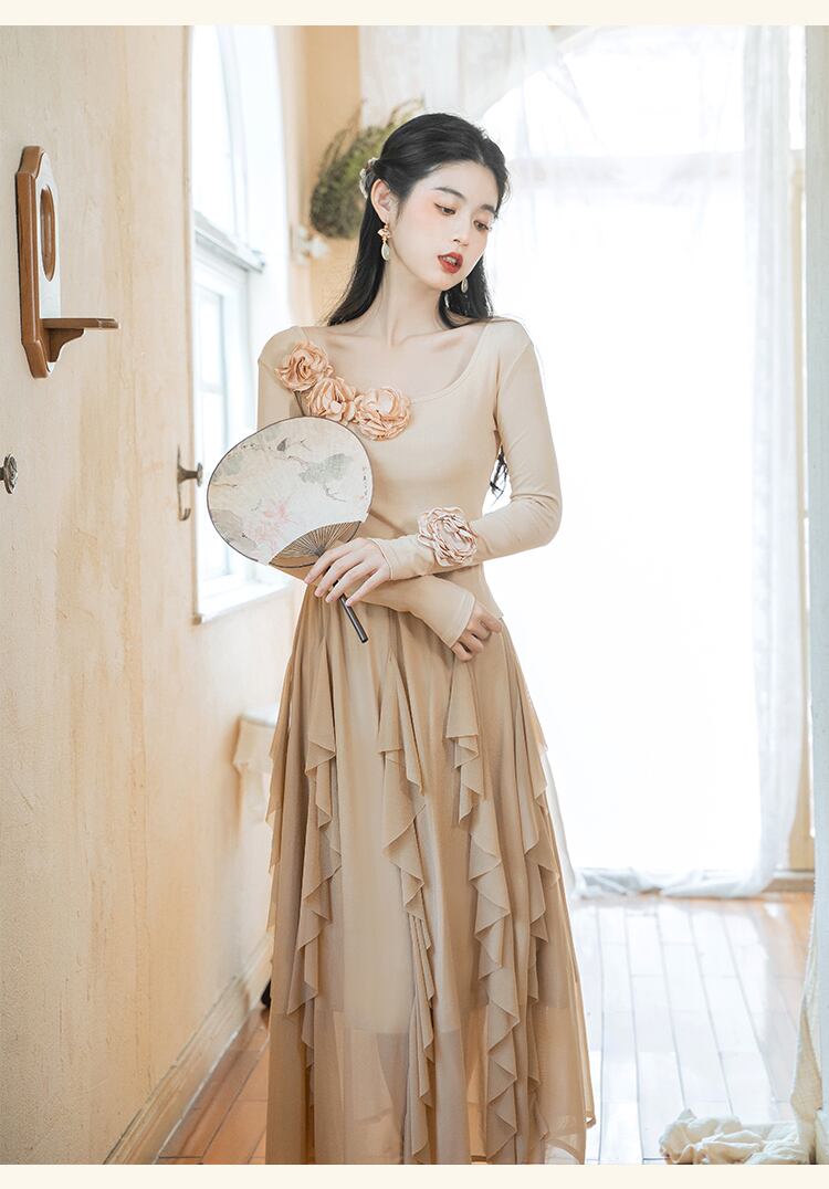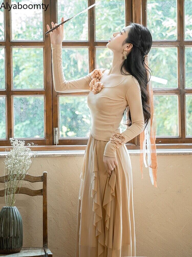 送料無料୨♥୧ スプリングレディースセット フローラルフリルロングスカート レッド ラッフル 春物 メッシュ 花柄 Oネック AOS36354373050