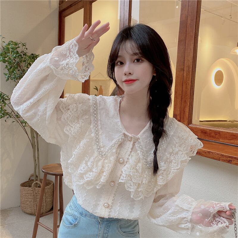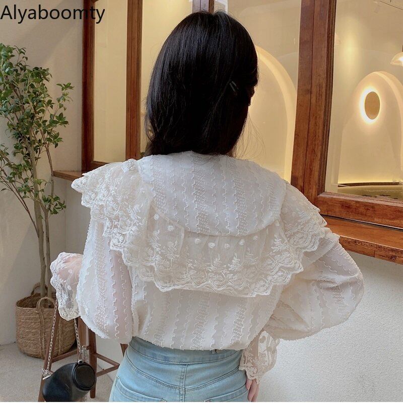 送料無料୨♥୧ スプリングオータムレディースレースブラウス カラー刺繍フリルシャツ ラッフル 大人ガーリー スウィート キュート カジュアル 春物 秋物 AOS90239500607