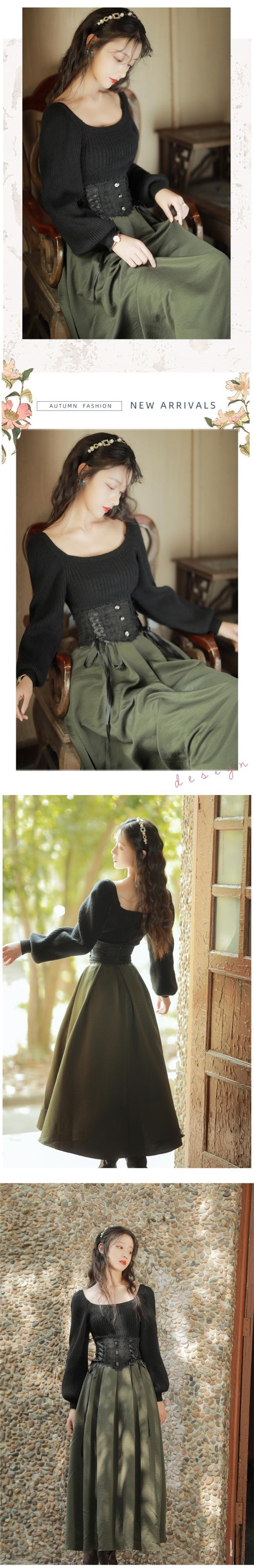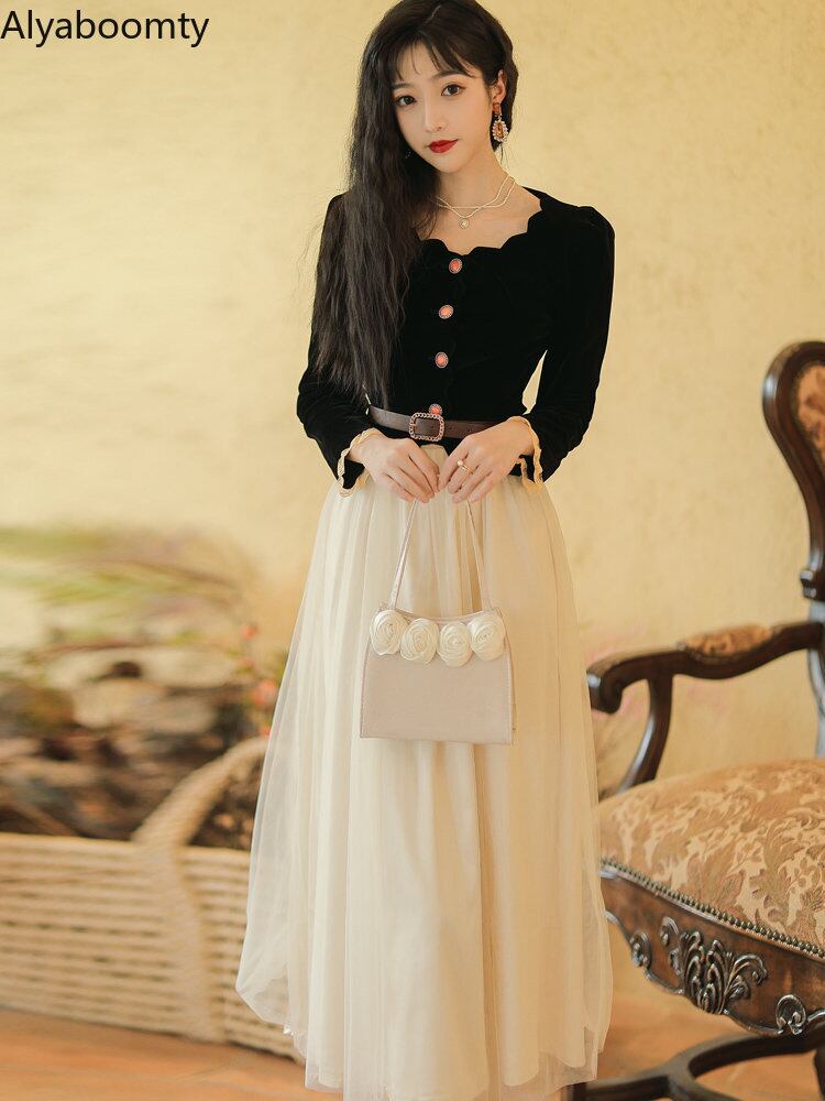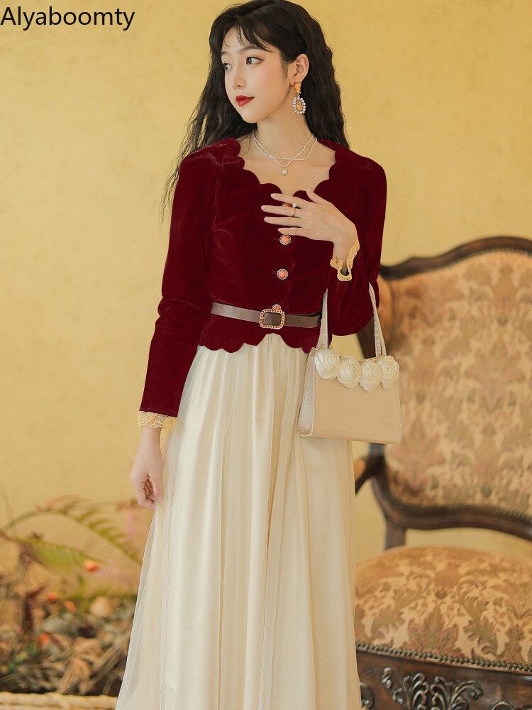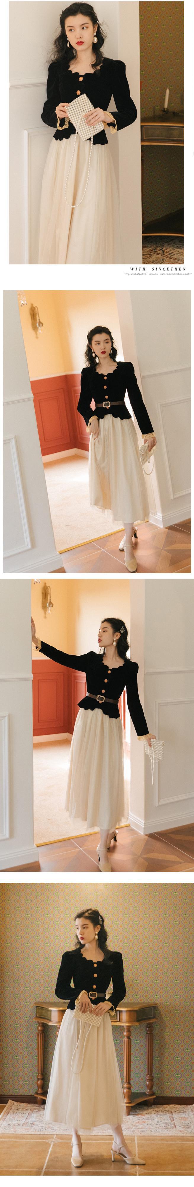 送料無料୨♥୧ スタイルオータムウィンターレディースセット ブラックレッドベルベットクロップトップ トップス ミディメッシュスカート 秋物 冬物 ハーネス ベルト ヨーロピアン AOS19411228757