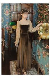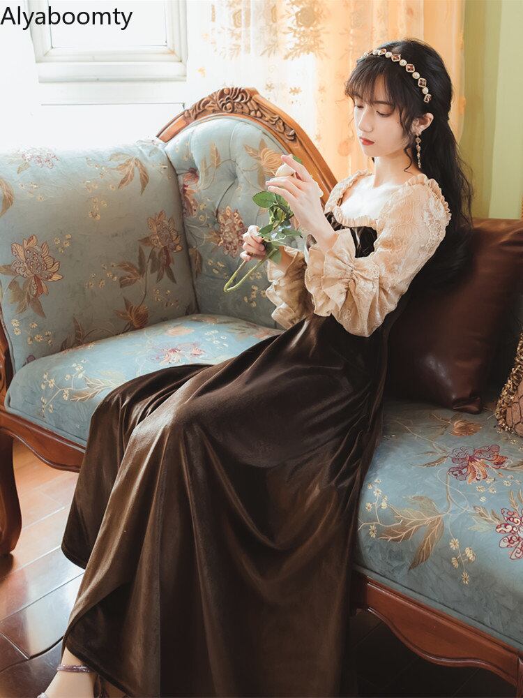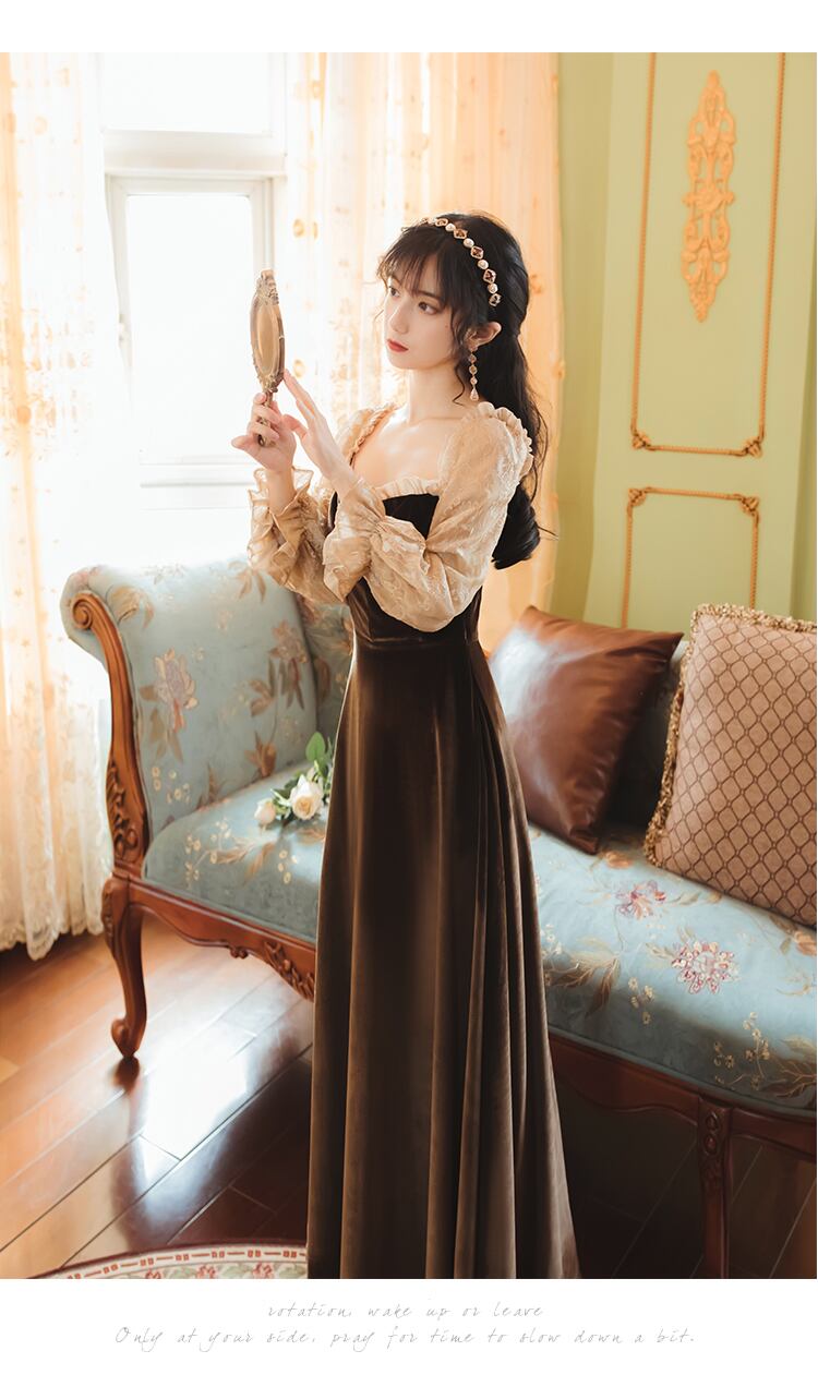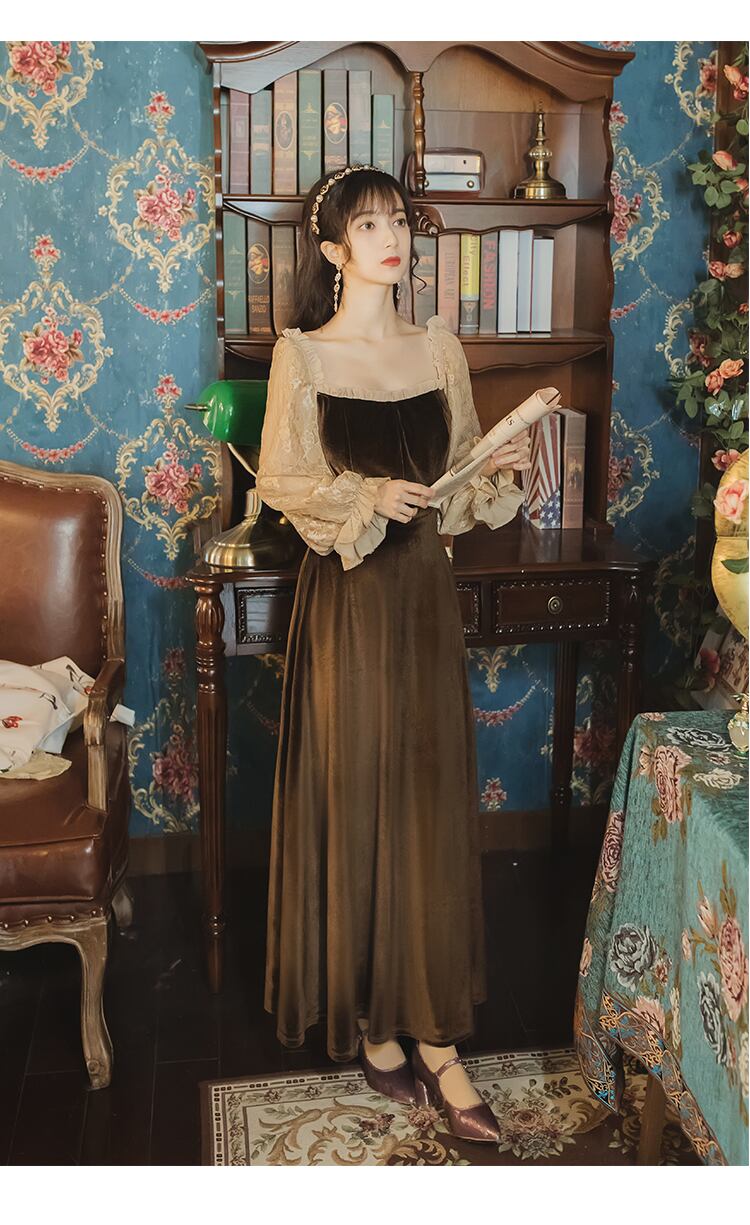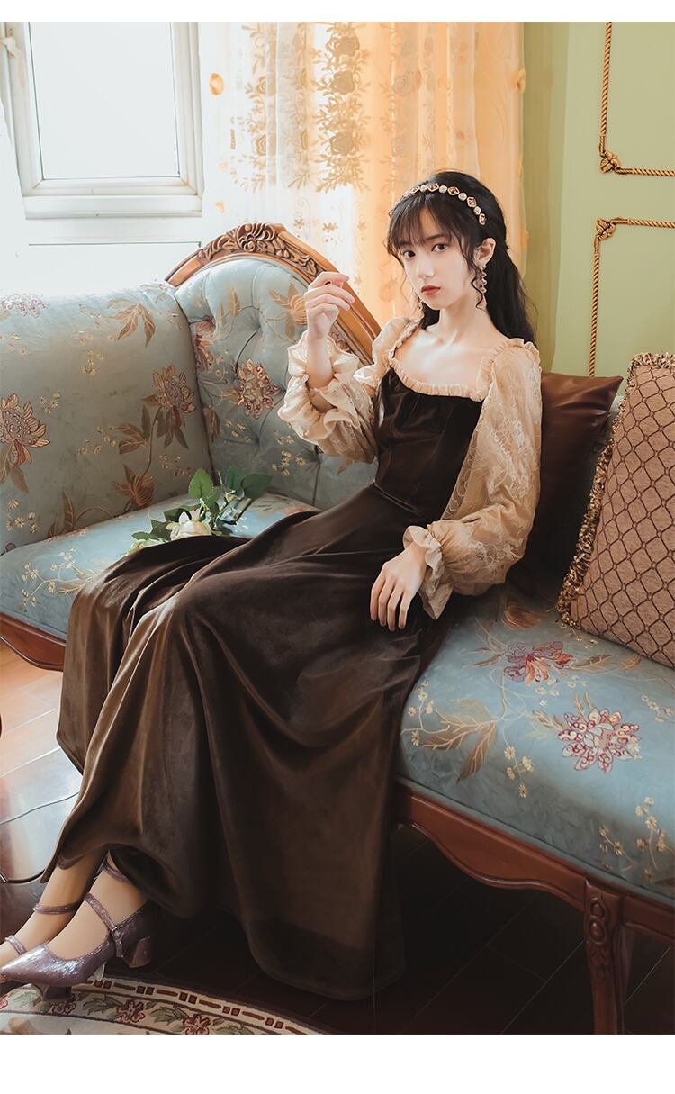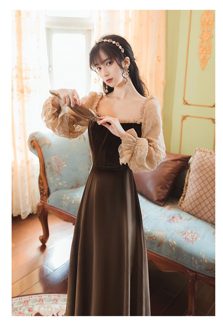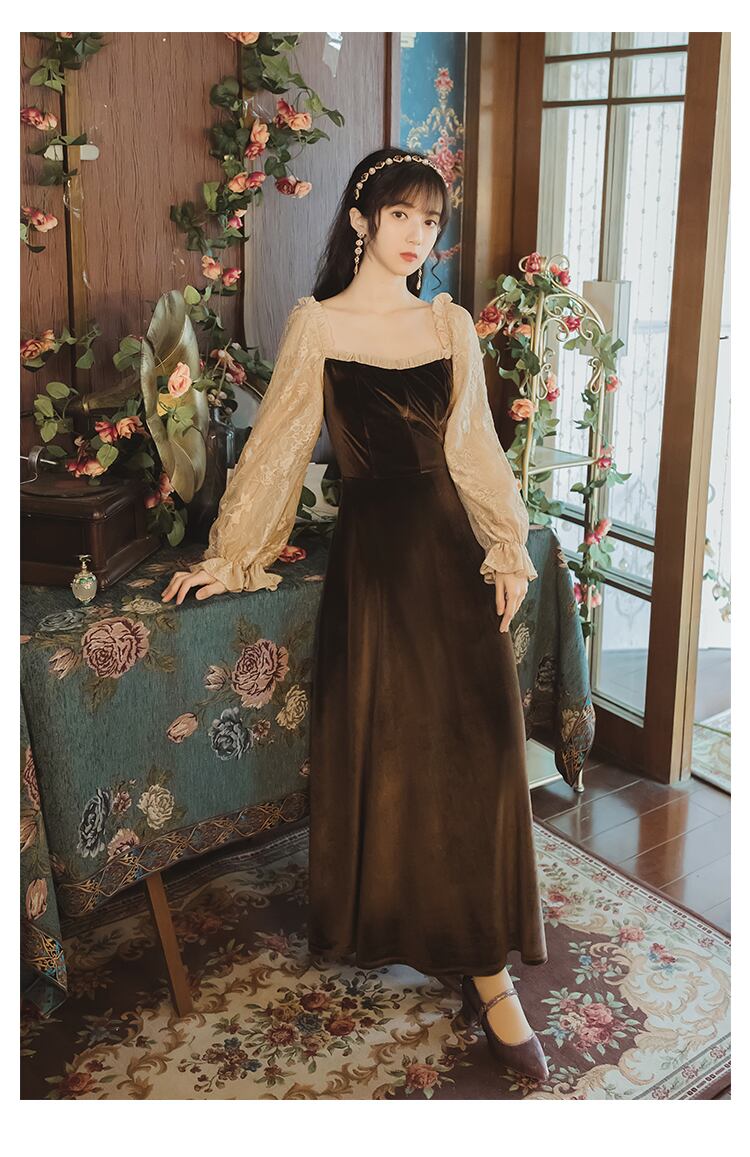 送料無料୨♥୧ オータムウィンターレディースロングドレス カラーブラウンベルベットヴィンテージレーススリーブドレス ワンピース 大人ガーリー スウィート キュート カジュアル 秋物 冬物 スクウェア ビンテージ AOS35617783969