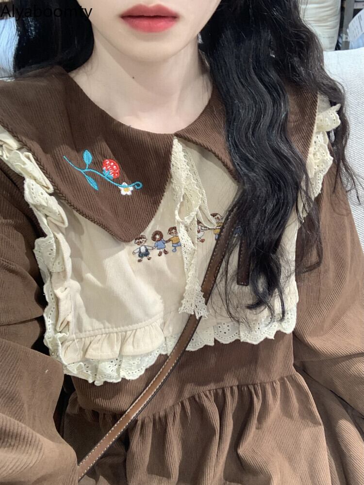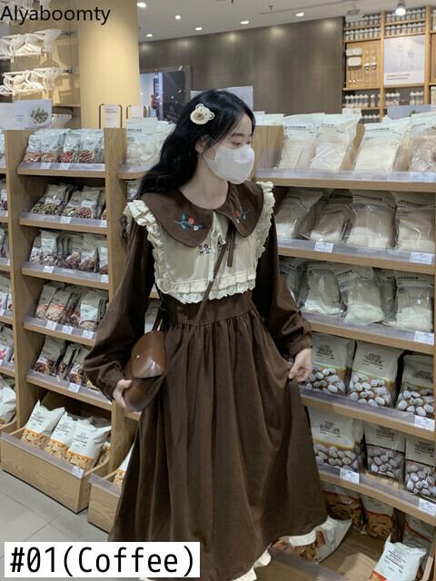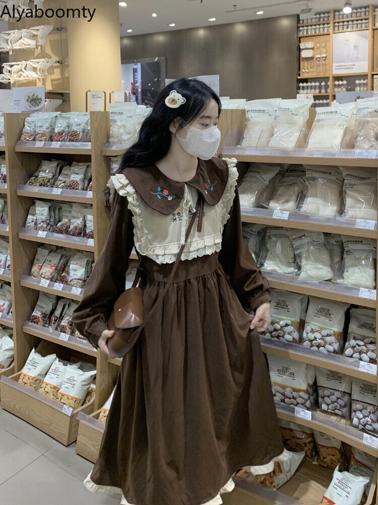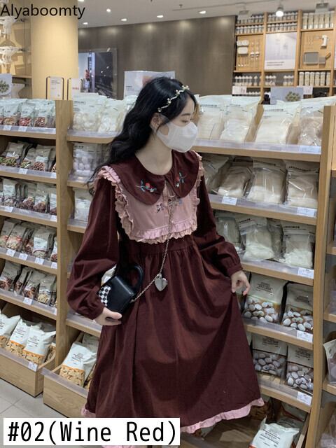 送料無料୨♥୧ オータムウィンターレディースルーズドレス カラーレッド刺繍フローラルミディ 大人ガーリー スウィート キュート カジュアル 秋物 冬物 花柄 AOS59651523002