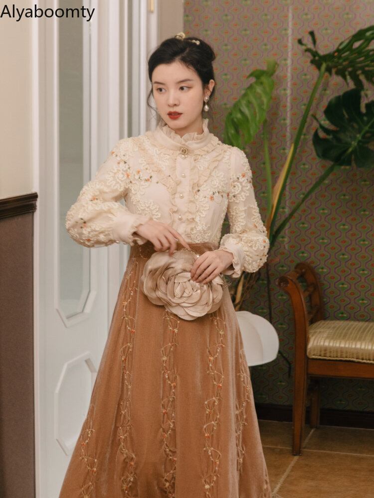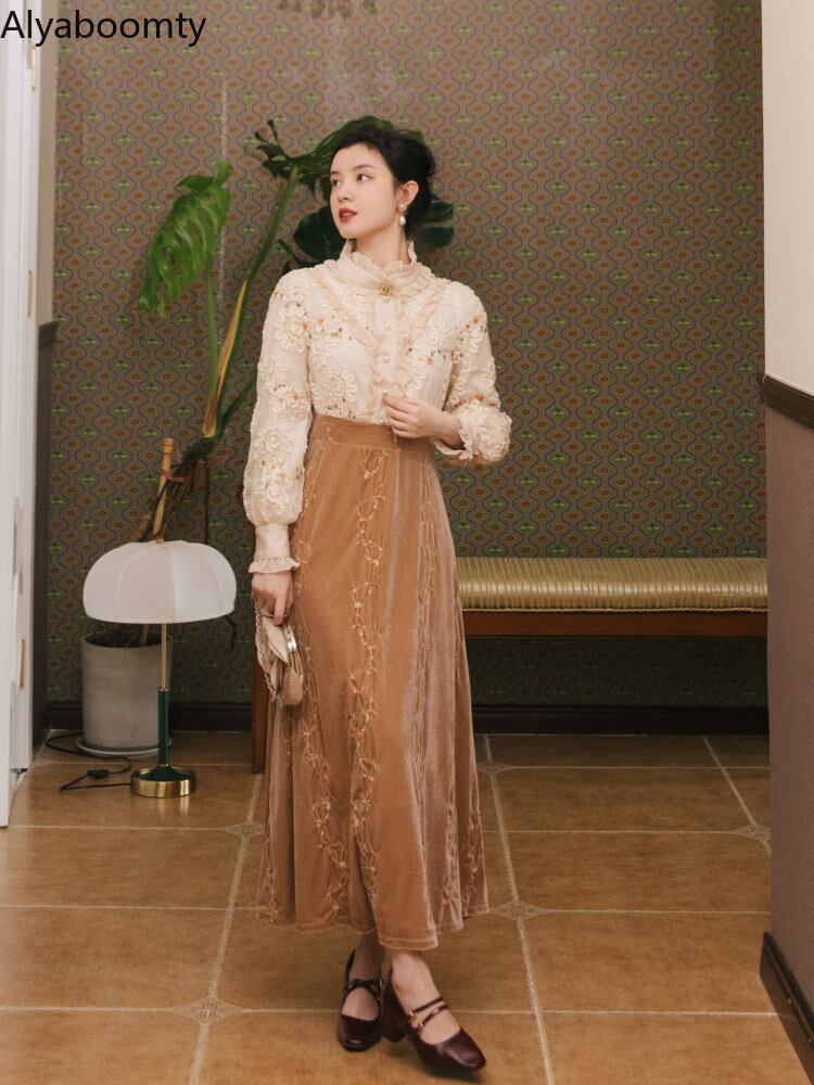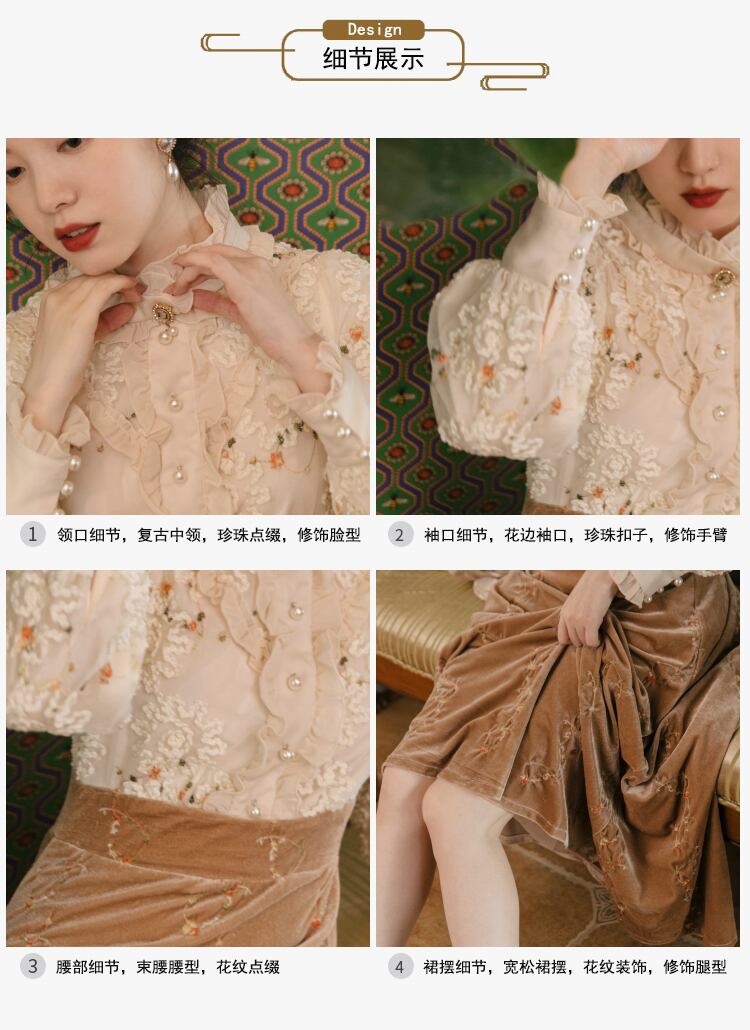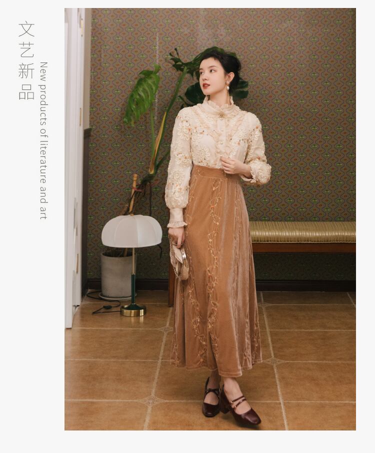 送料無料୨♥୧ オータムウィンターレディースミディドレス スタンドカラーカラーパッチワークフローラルベルベット 秋物 冬物 花柄 AOS7628379850