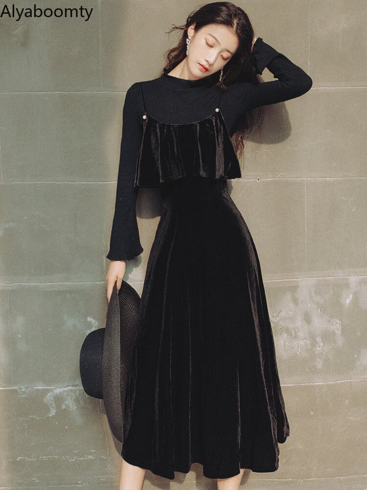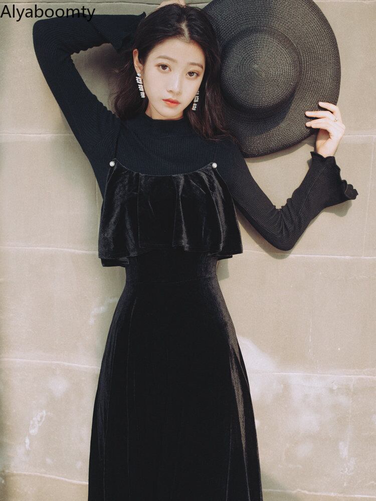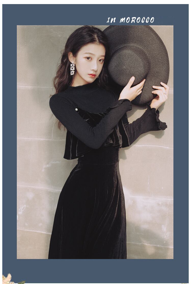送料無料୨♥୧ スタイルオータムウィンタードレス ブラックニット セーター ベルベットミディ フリル ラッフル 秋物 冬物 AOS96477312030