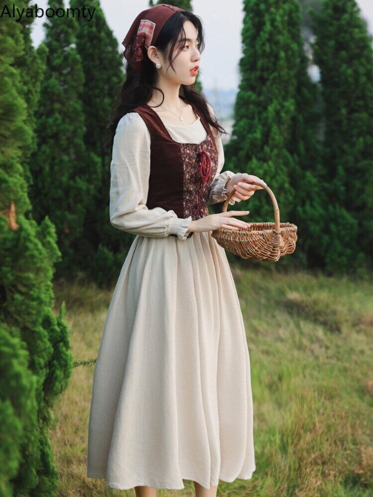 送料無料୨♥୧ スプリングオータムレディースドレス ソリッド ミディヴィンテージ コットン 大人ガーリー スウィート キュート カジュアル 春物 秋物 ソリッドカラー ビンテージ AOS86111540372