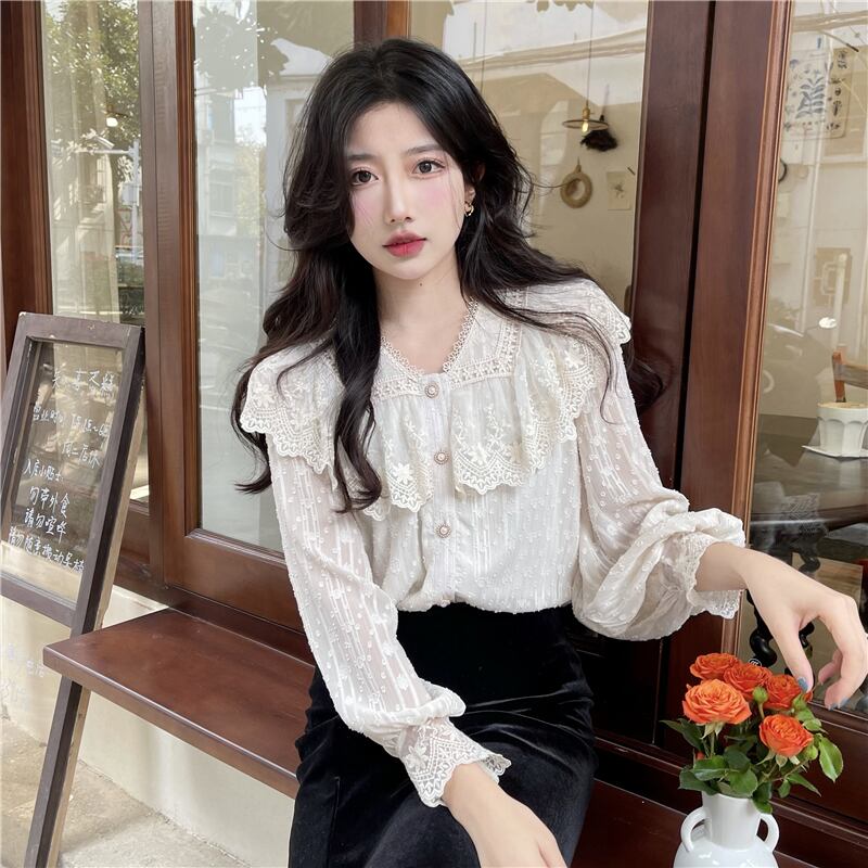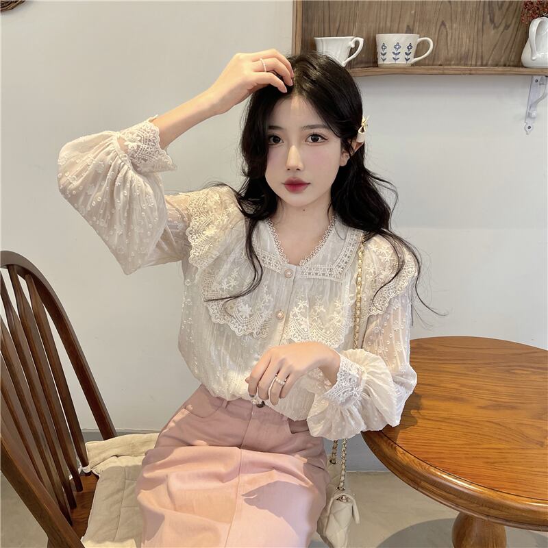 送料無料୨♥୧ スプリングオータムレディースブラウス Vネックフローラルレース刺繍長袖スリーブシャツ ロング 大人ガーリー スウィート キュート カジュアル 春物 秋物 花柄 AOS81396715070