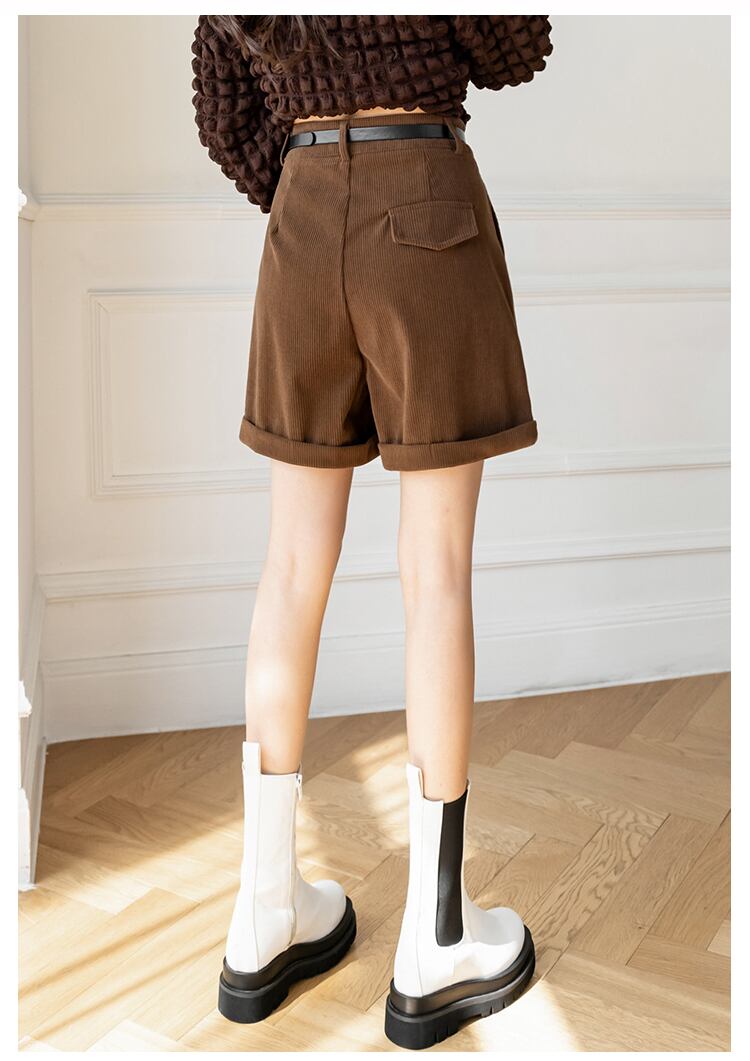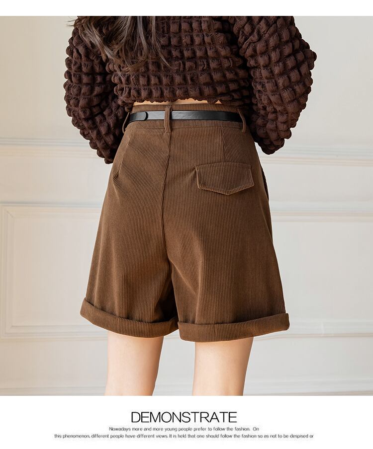 送料無料୨♥୧ オータムウィンターレディースショーツ ウェストブラックソリッド ベルト コーデュロイワイドレッグ 秋物 冬物 ハーネス ブルマー ワイドパンツ ソリッドカラー AOS22398687698
