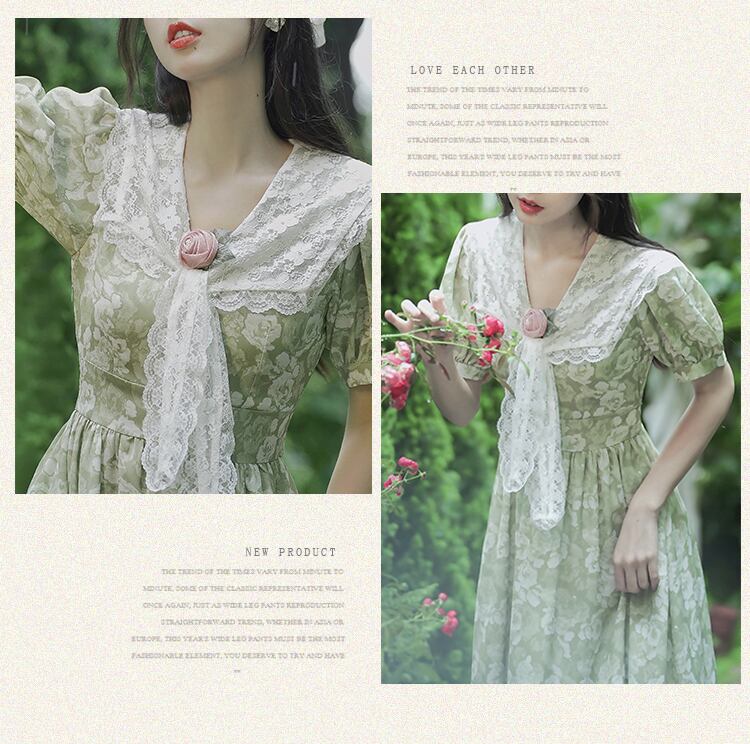 送料無料୨♥୧ サマーレディースミディドレス Vネックレースフリルフローラルプリントグリーン ラッフル 大人ガーリー スウィート キュート カジュアル 夏物 花柄 AOS92442841720