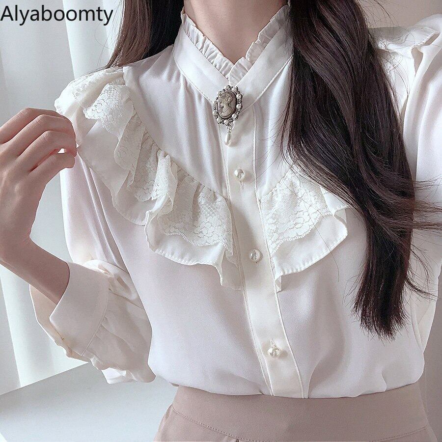 送料無料୨♥୧ スタイルスプリングオータムレディースブラウス スタンドカラーカラーベージュネイビーレースフリル ラッフル 大人ガーリー スウィート キュート カジュアル 春物 秋物 AOS97829174431