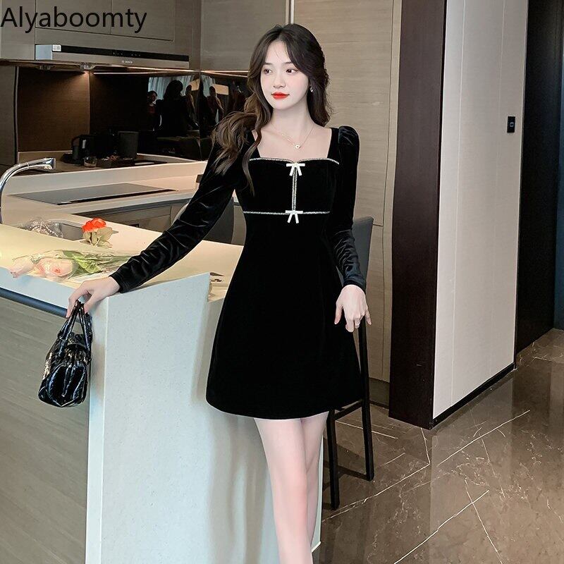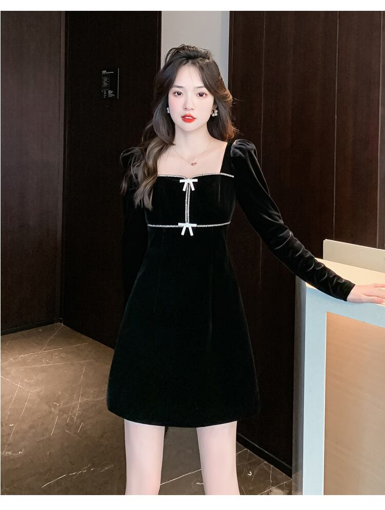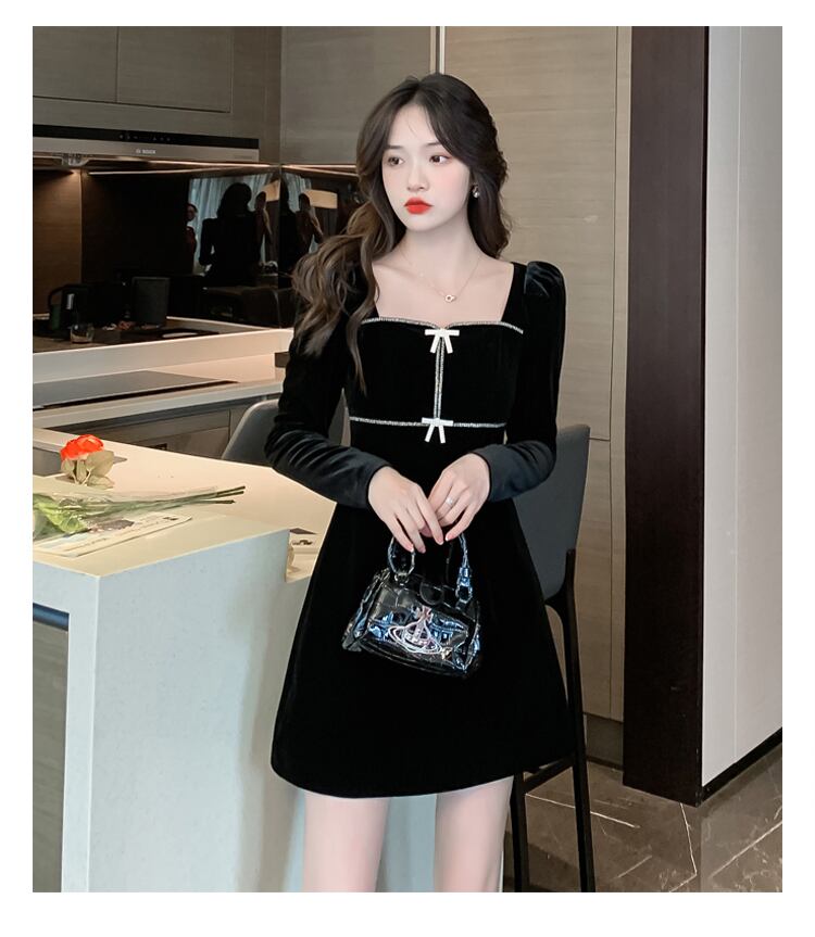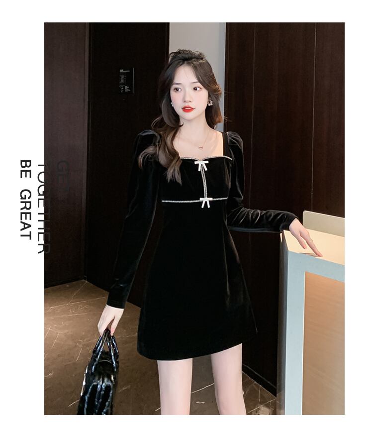 送料無料୨♥୧ ウィンターレディースブラックミニドレス カラーリボンスリーブベルベット 冬物 スクウェア 会社 学校 通勤や通学にも AOS58592867262