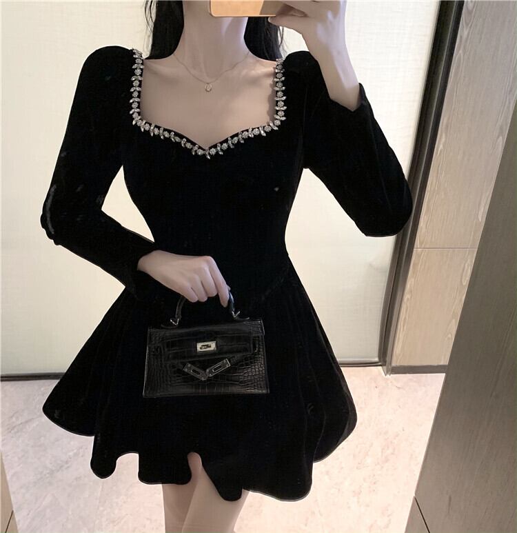 送料無料୨♥୧ オータムウィンターレディースブラックミニドレス カラーAラインベルベットショート 大人ガーリー スウィート キュート カジュアル 秋物 冬物 スクウェア AOS64761044804