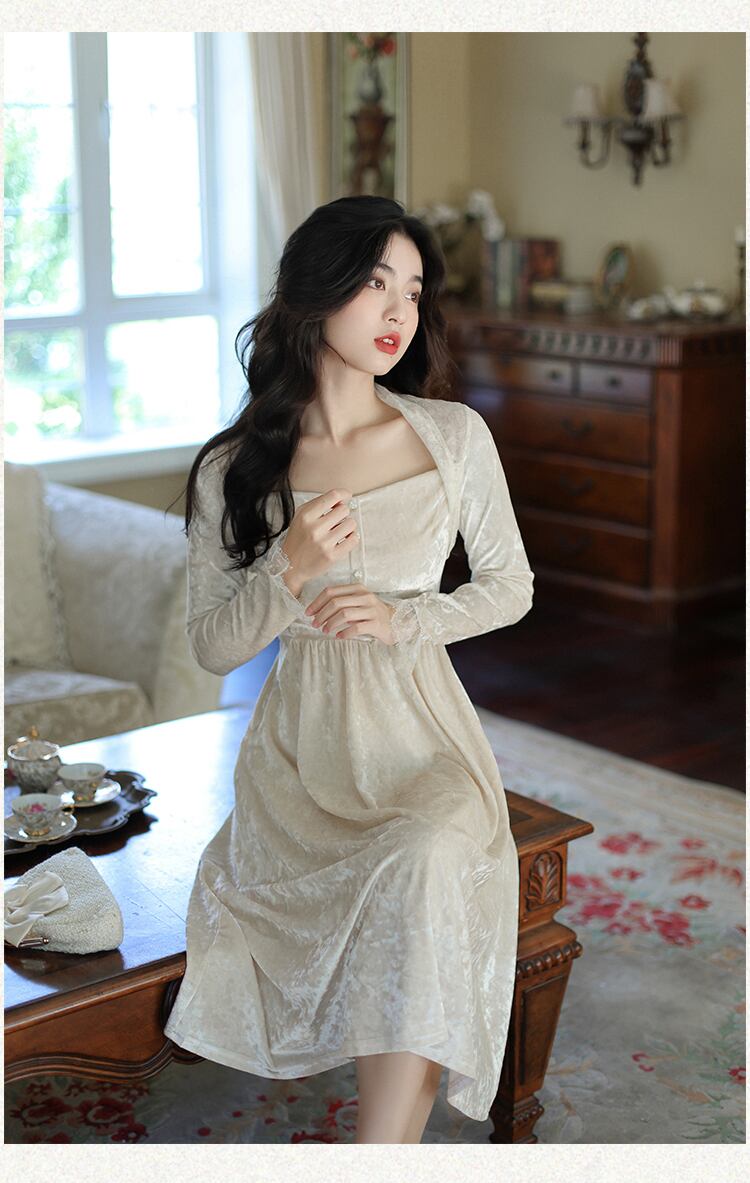 送料無料୨♥୧ オータムウィンターレディースミディベルベットドレス パッチワークレース 秋物 冬物 AOS49191188567