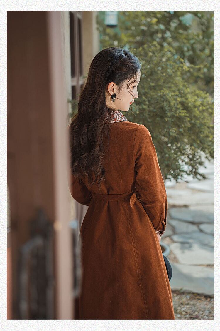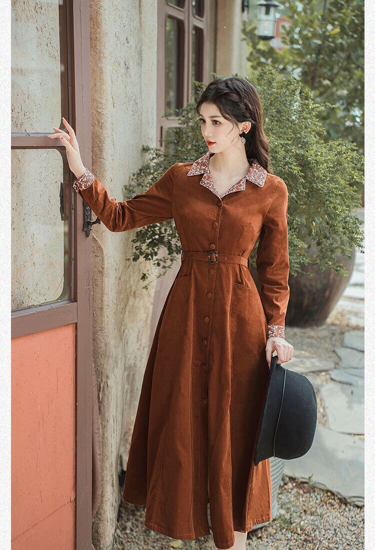 送料無料୨♥୧ スタイルオータムスプリングレディースミディシャツ ドレス カラーブラウンコーデュロイカーディガンヴィンテージ 春物 秋物 ビンテージ ヨーロピアン AOS89786789996