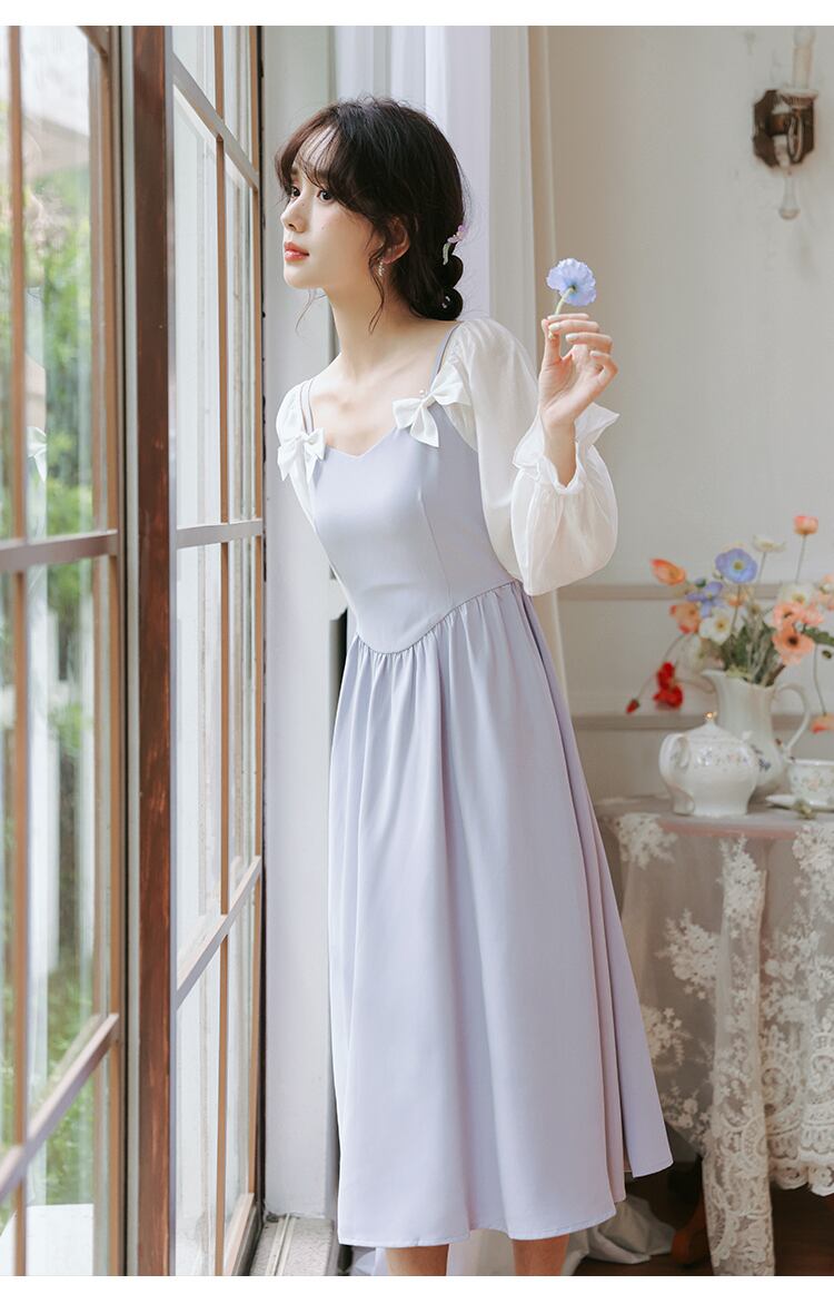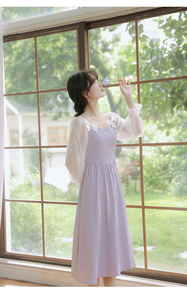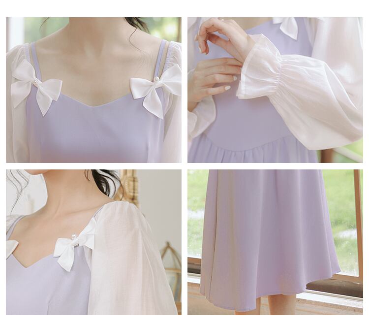 送料無料୨♥୧ スプリングオータムレディースドレス スリーブリボンAライン 大人ガーリー スウィート キュート カジュアル 春物 秋物 パープル AOS82867819364