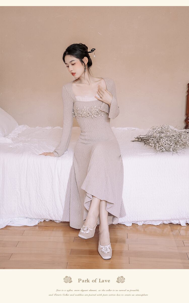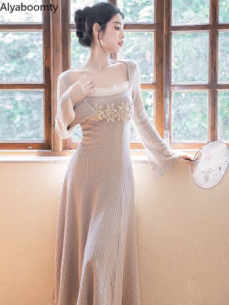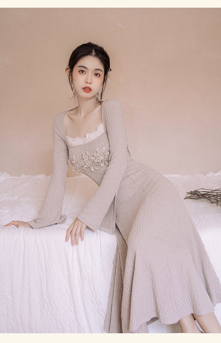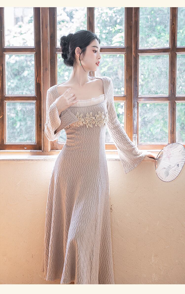 送料無料୨♥୧ オータムウィンターセーター ドレス カラーフローラルニット スリーブミディ フレアスリーブ 大人ガーリー スウィート キュート カジュアル 秋物 冬物 花柄 スクウェア AOS15999651000
