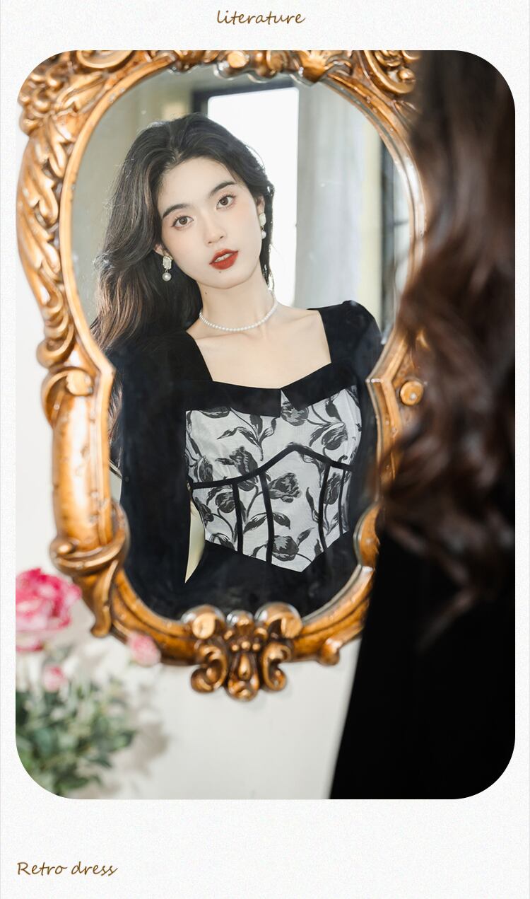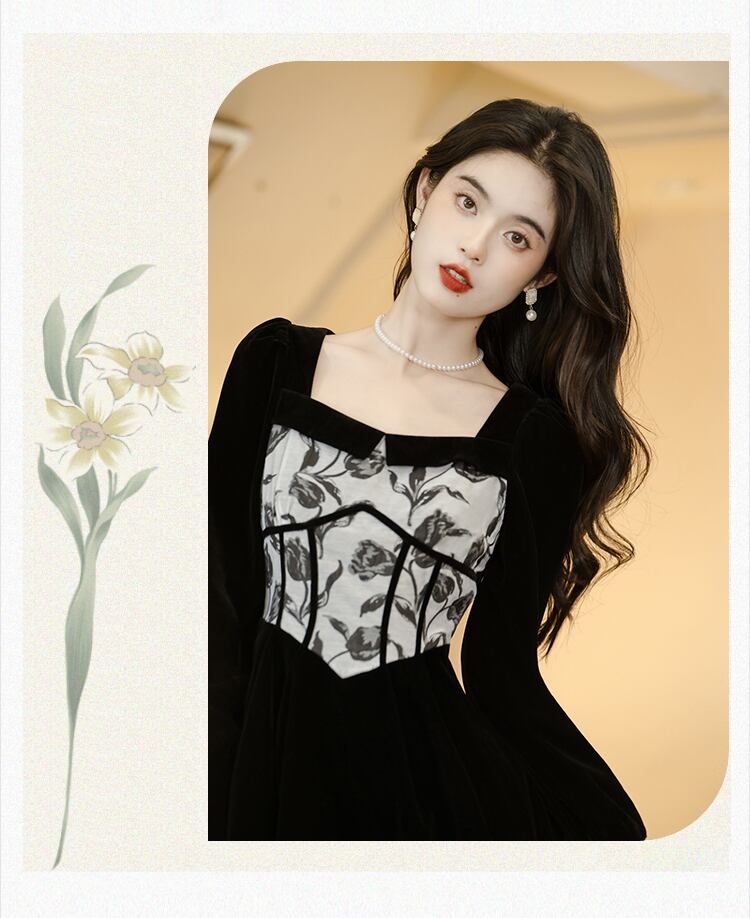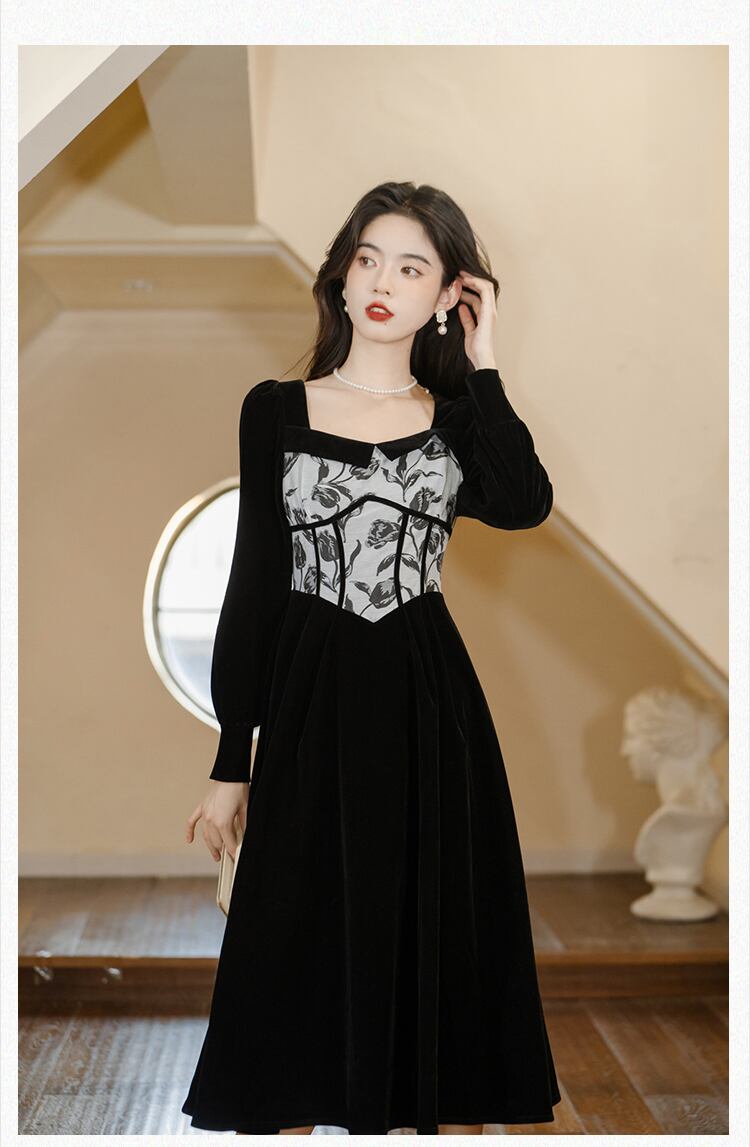 送料無料୨♥୧ オータムウィンターレディースブラックヴィンテージドレス カラースリムジャカードパッチワークAラインベルベットミディ 秋物 冬物 スクウェア ビンテージ AOS45243818513