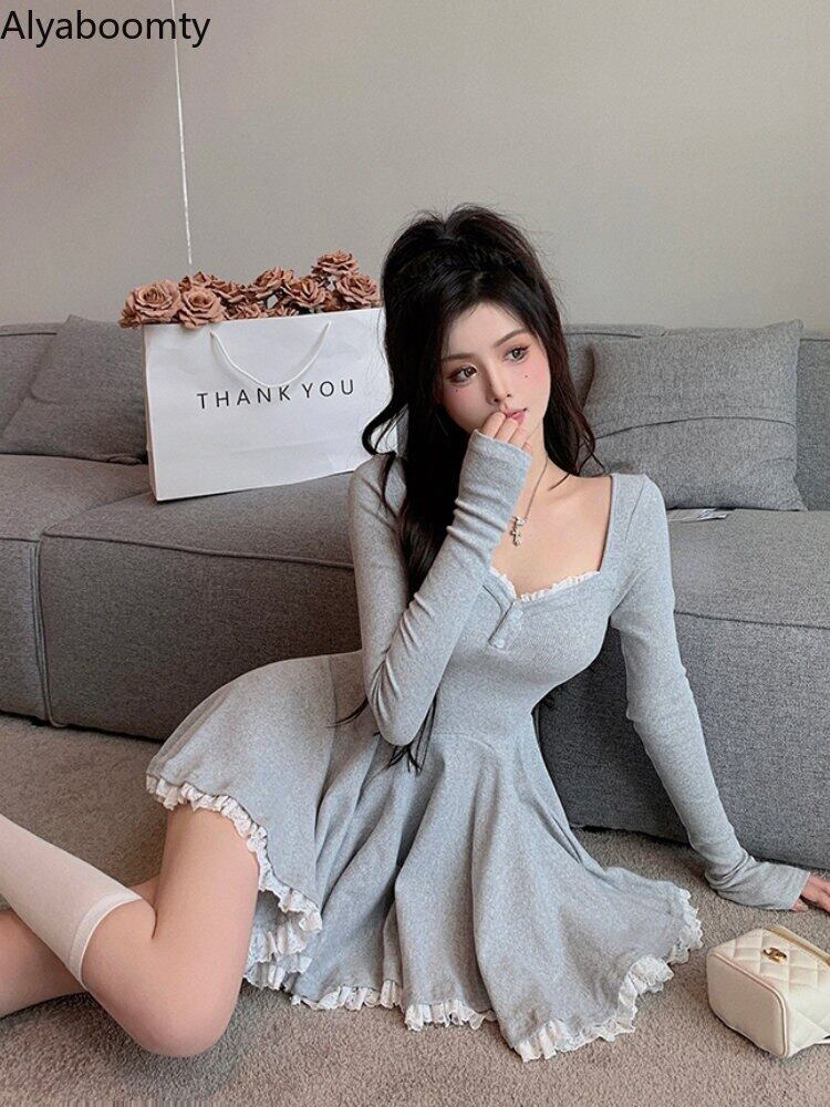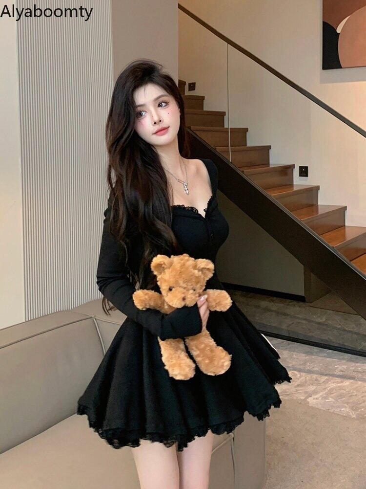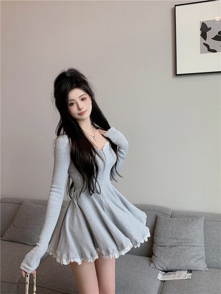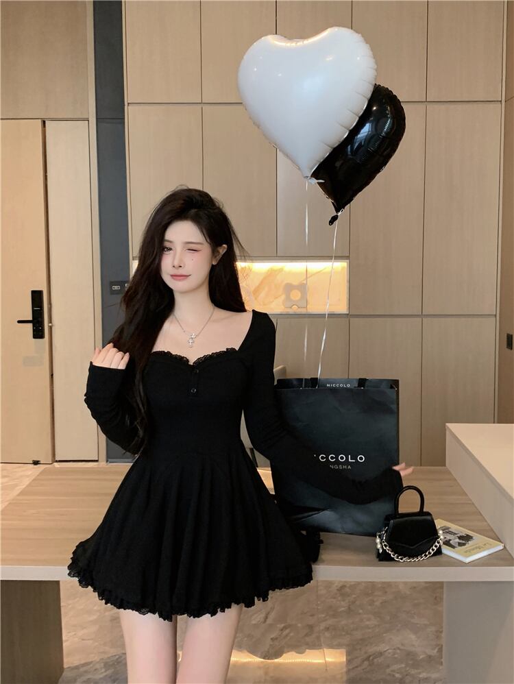 送料無料୨♥୧ オータムウィンターレディースミニプリーツドレス カラーブラックグレースリムレースフリルニット ショート ラッフル 秋物 冬物 スクウェア AOS54391013459