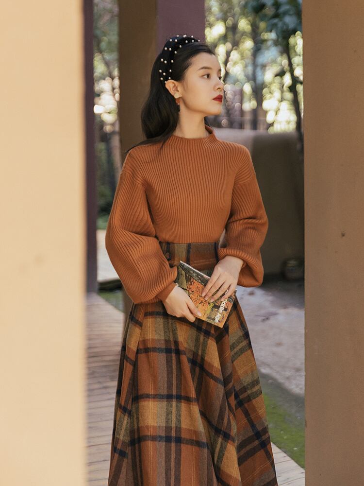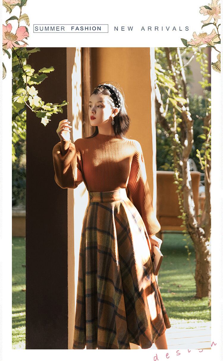送料無料୨♥୧ スタイルオータムウィンターレディーススリーブニット セーター 格子柄ミディスカート ヴィンテージセット ランタンスリーブ 秋物 冬物 ビンテージ ヨーロピアン AOS20307748970