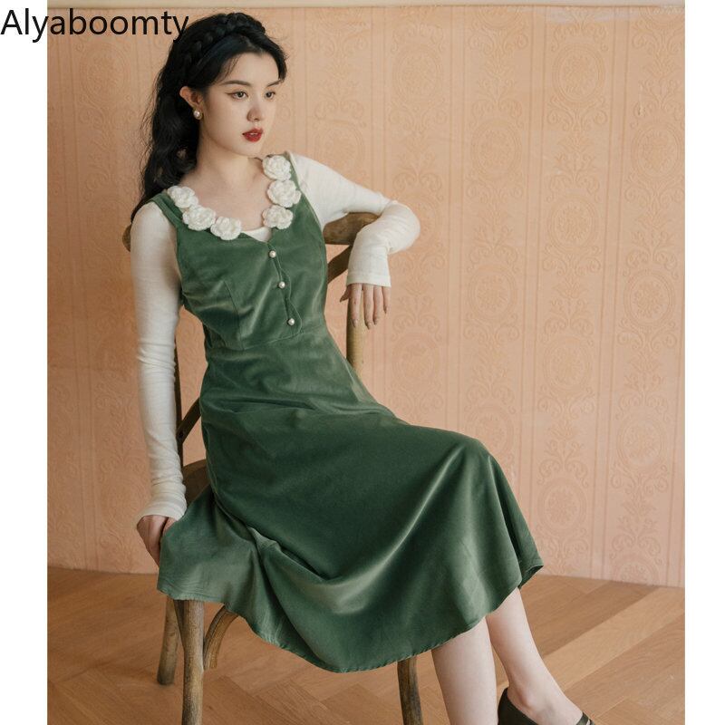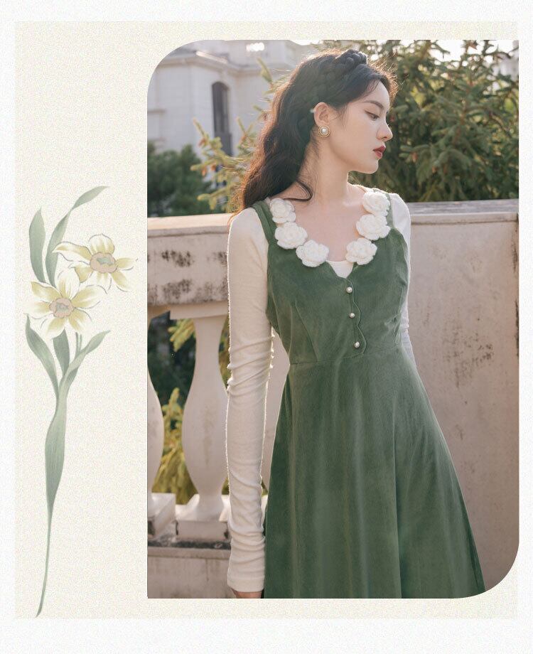 送料無料୨♥୧ オータムウィンターレディースドレス フローラルコーデュロイミディ 大人ガーリー スウィート キュート カジュアル 秋物 冬物 花柄 グリーン AOS74792224045