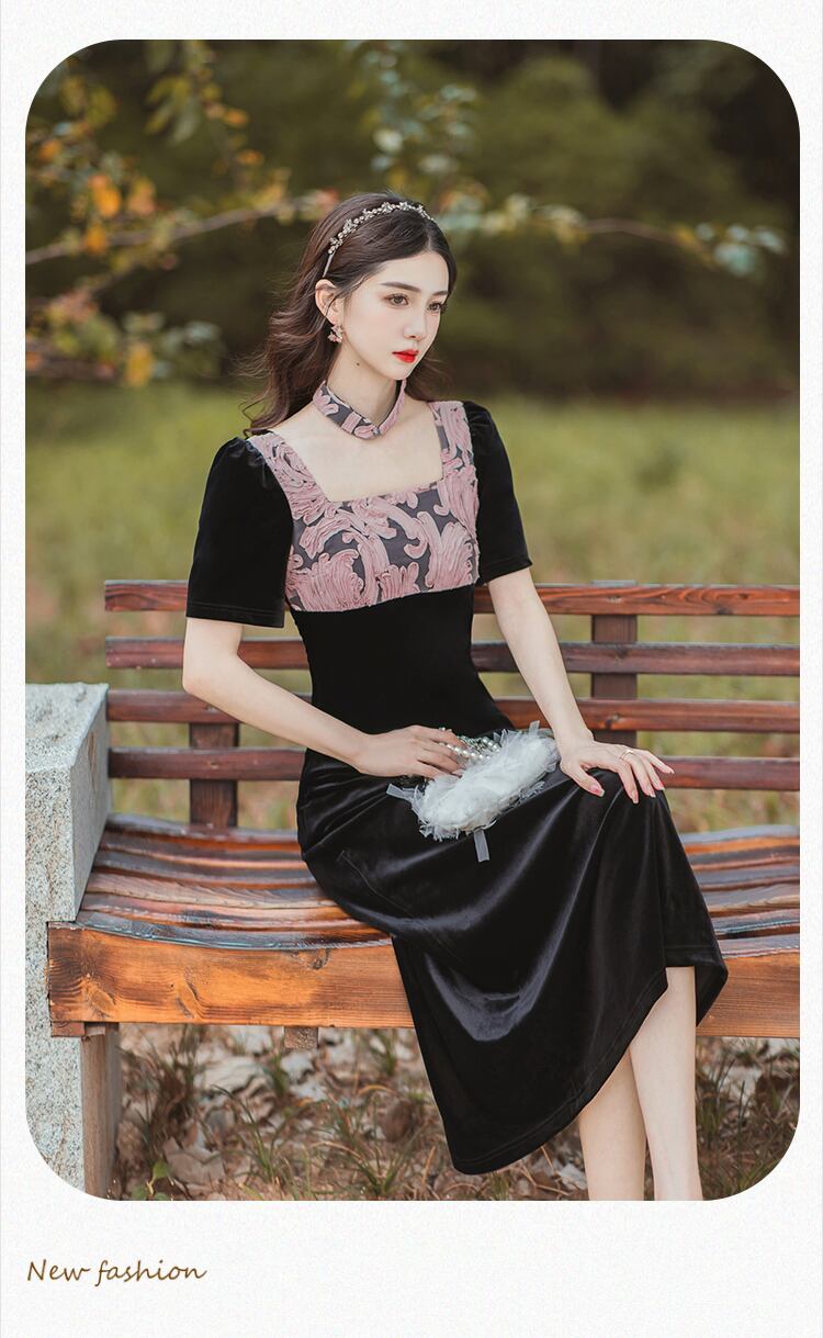 送料無料୨♥୧ スタイルオータムレディースブラックベルベットドレス カラーパッチワークジャカードAライン半袖スリーブ ショート ハーフスリーブ 秋物 スクウェア AOS31673644657