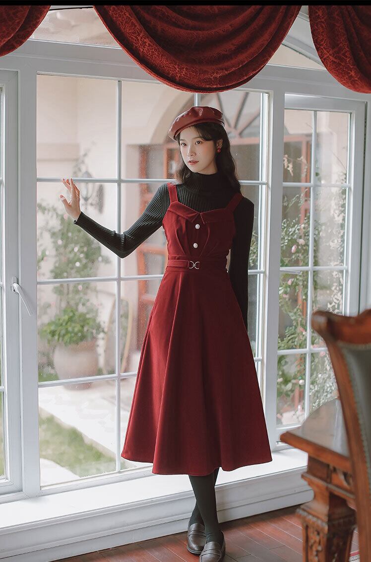 送料無料୨♥୧ オータムウィンターレディースコーデュロイドレス レッドブルーミディヴィンテージソリッド ノースリーブ 大人ガーリー スウィート キュート カジュアル 秋物 冬物 ソリッドカラー ビンテージ AOS29938162400