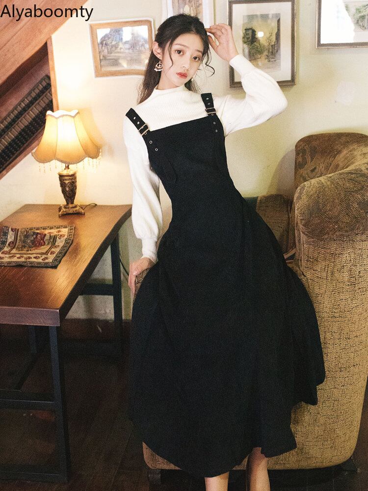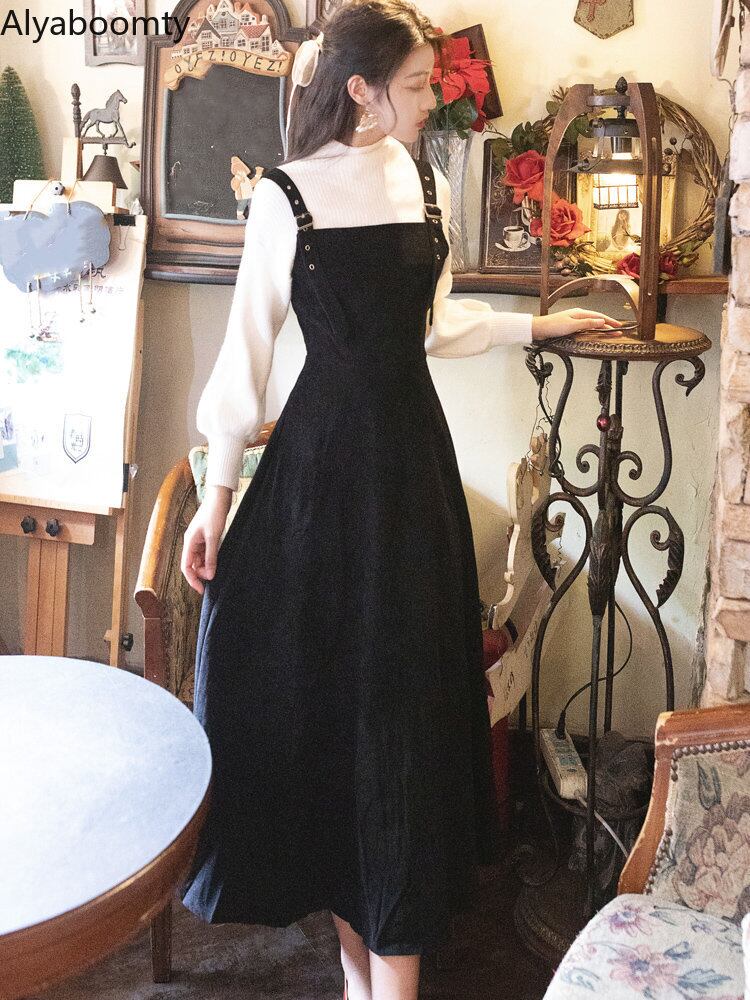 送料無料୨♥୧ スプリングオータムレディースミディブラックドレス コーデュロイソリッド ノースリーブヴィンテージAライン 春物 秋物 ソリッドカラー ビンテージ AOS38598307138
